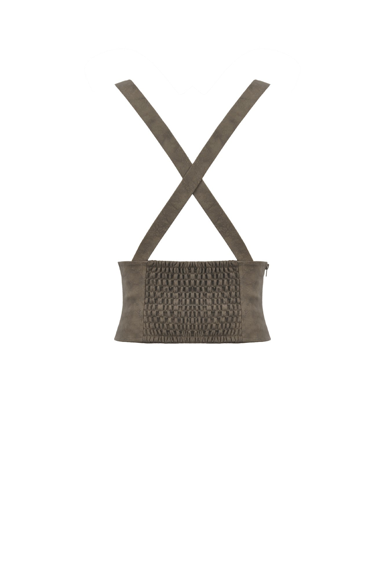 Structured corset-style harness with adjustable straps and a detachable pouch for essentials.