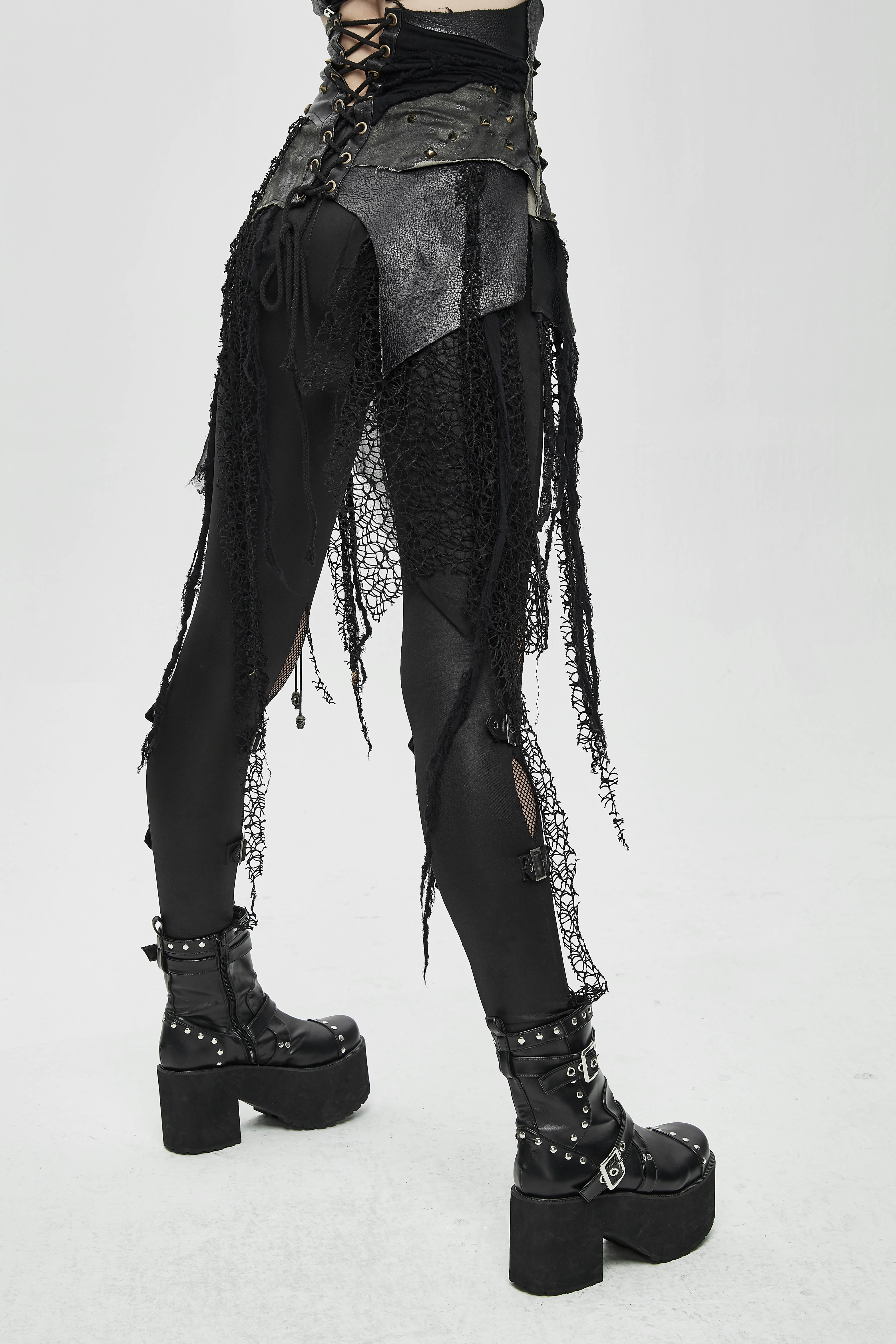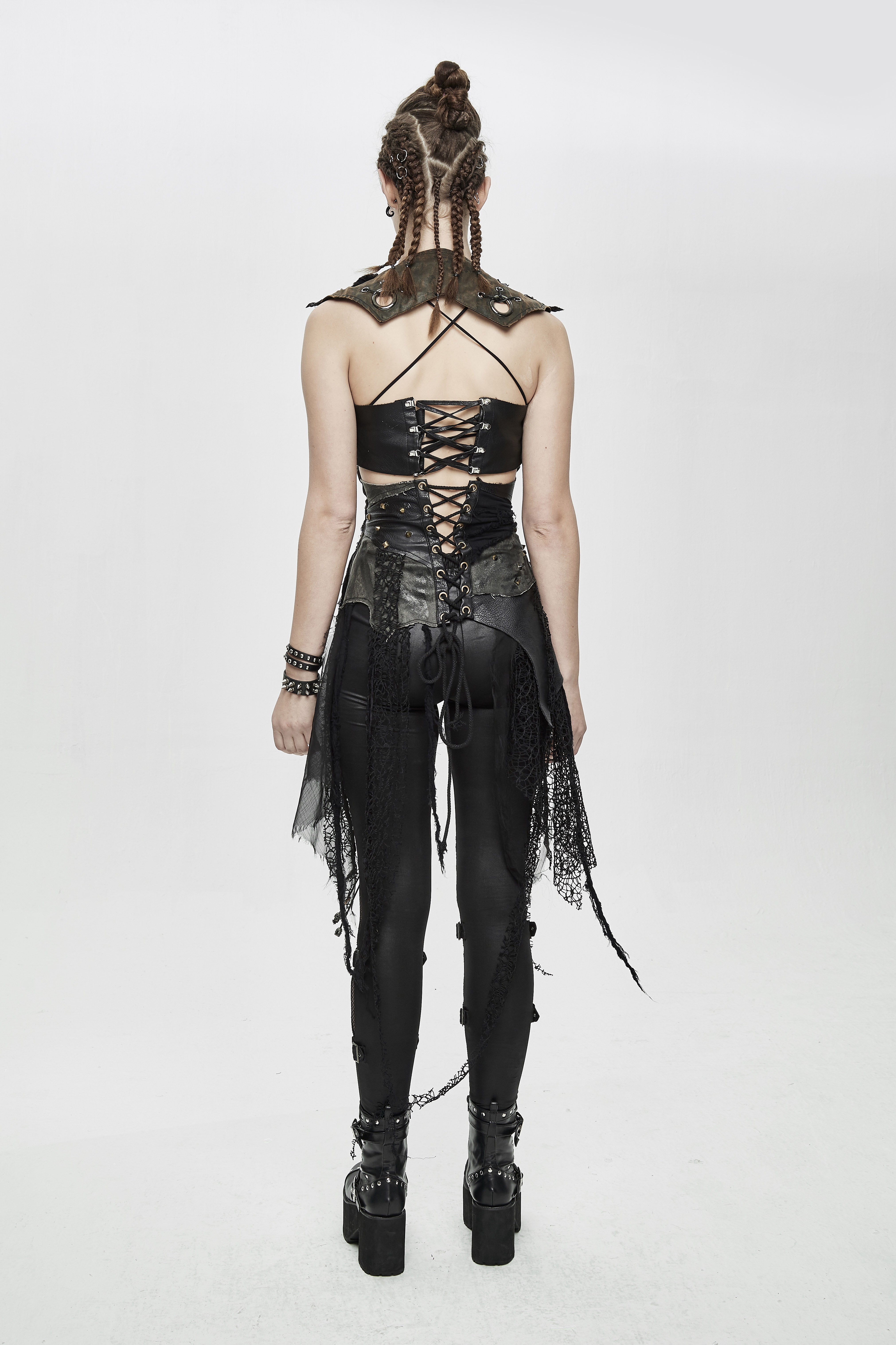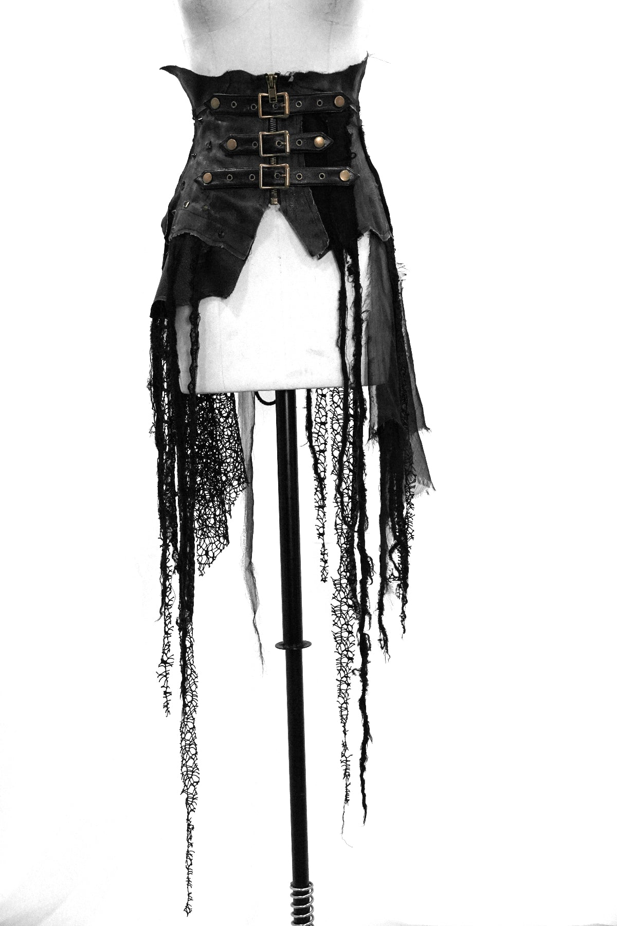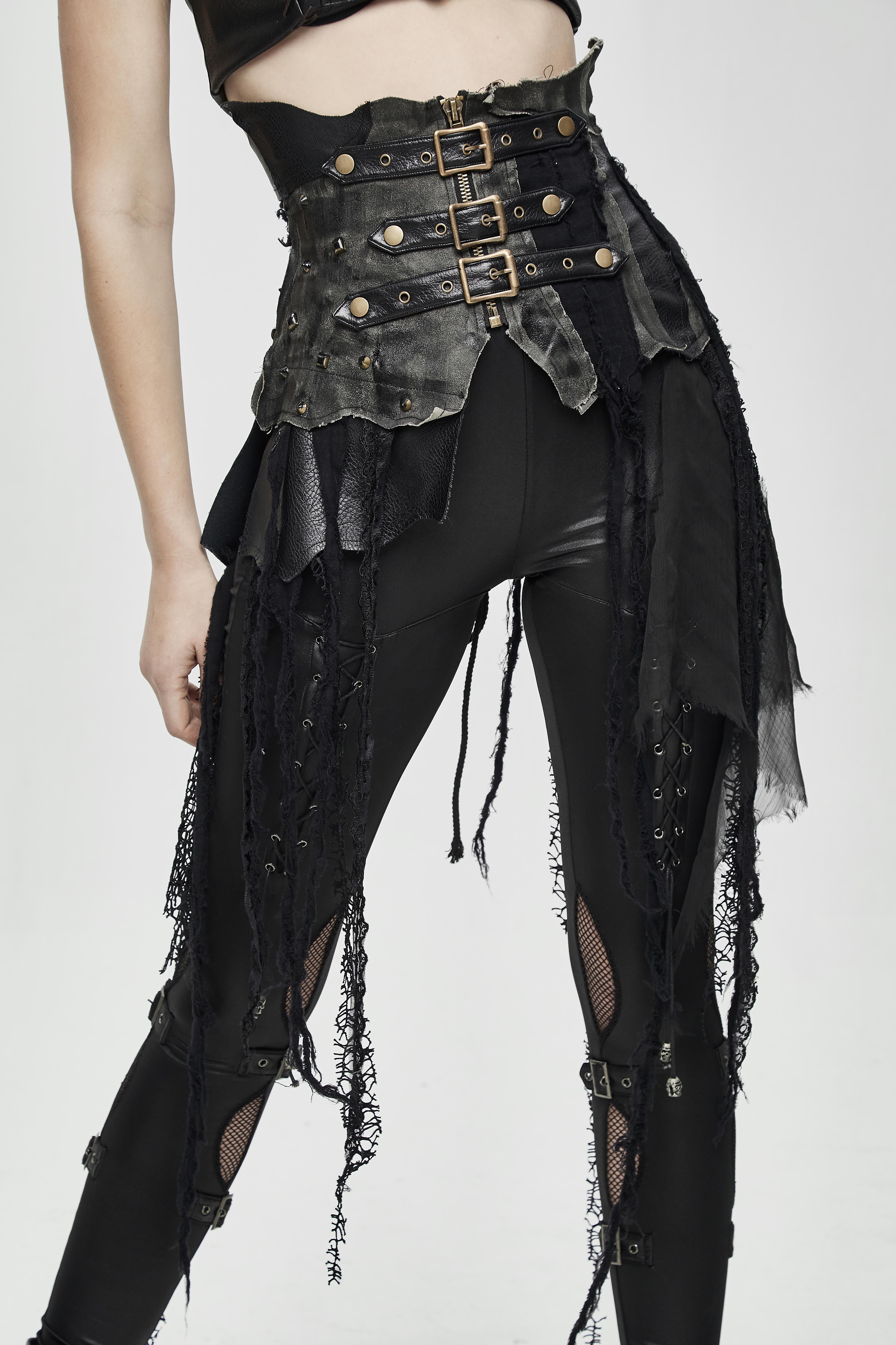Wasteland Empress Corset Belt shapes the waist with triple buckle closure and distressed faux leather panels, finished with shredded lace drapes for a fierce, post-apocalyptic layered look.