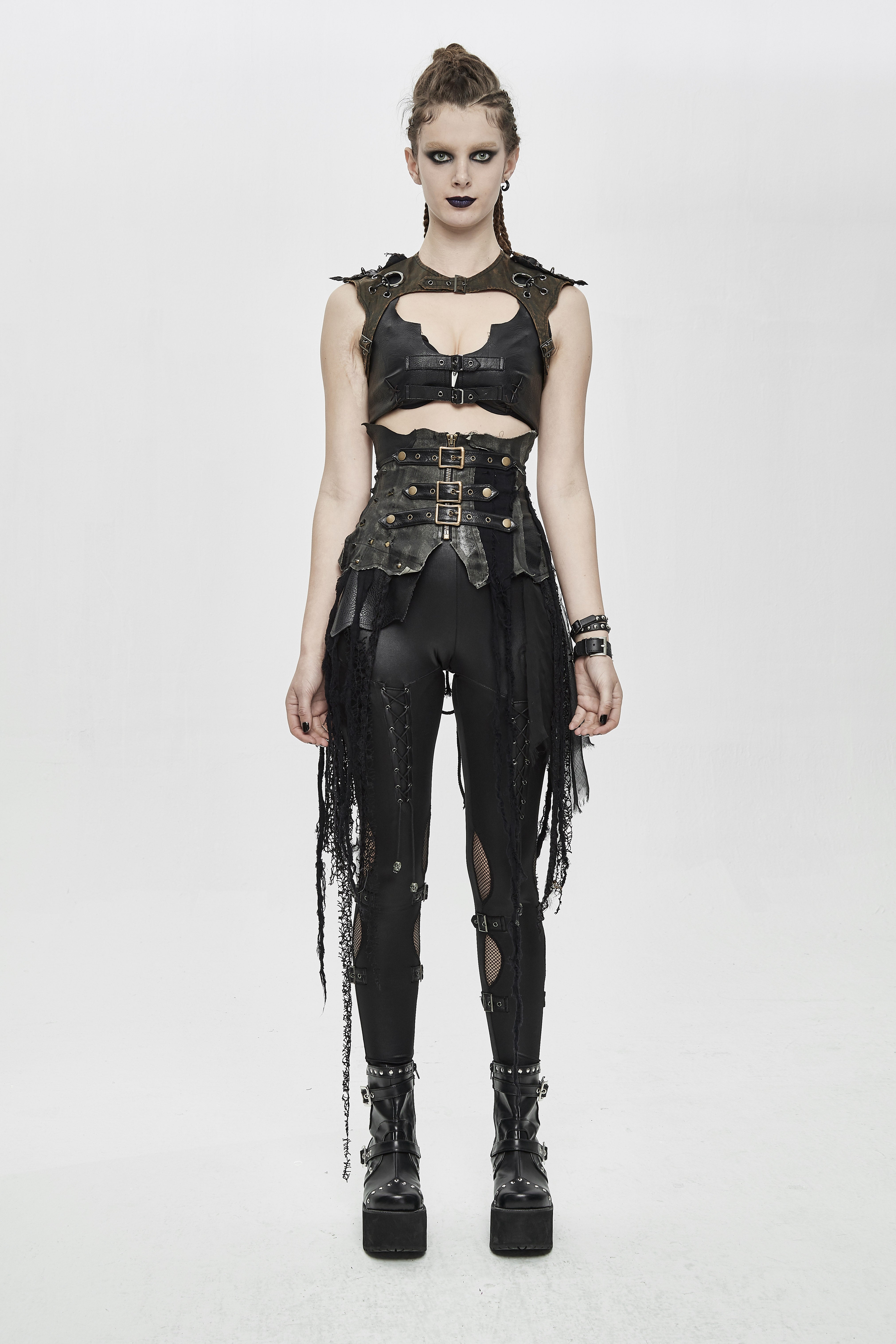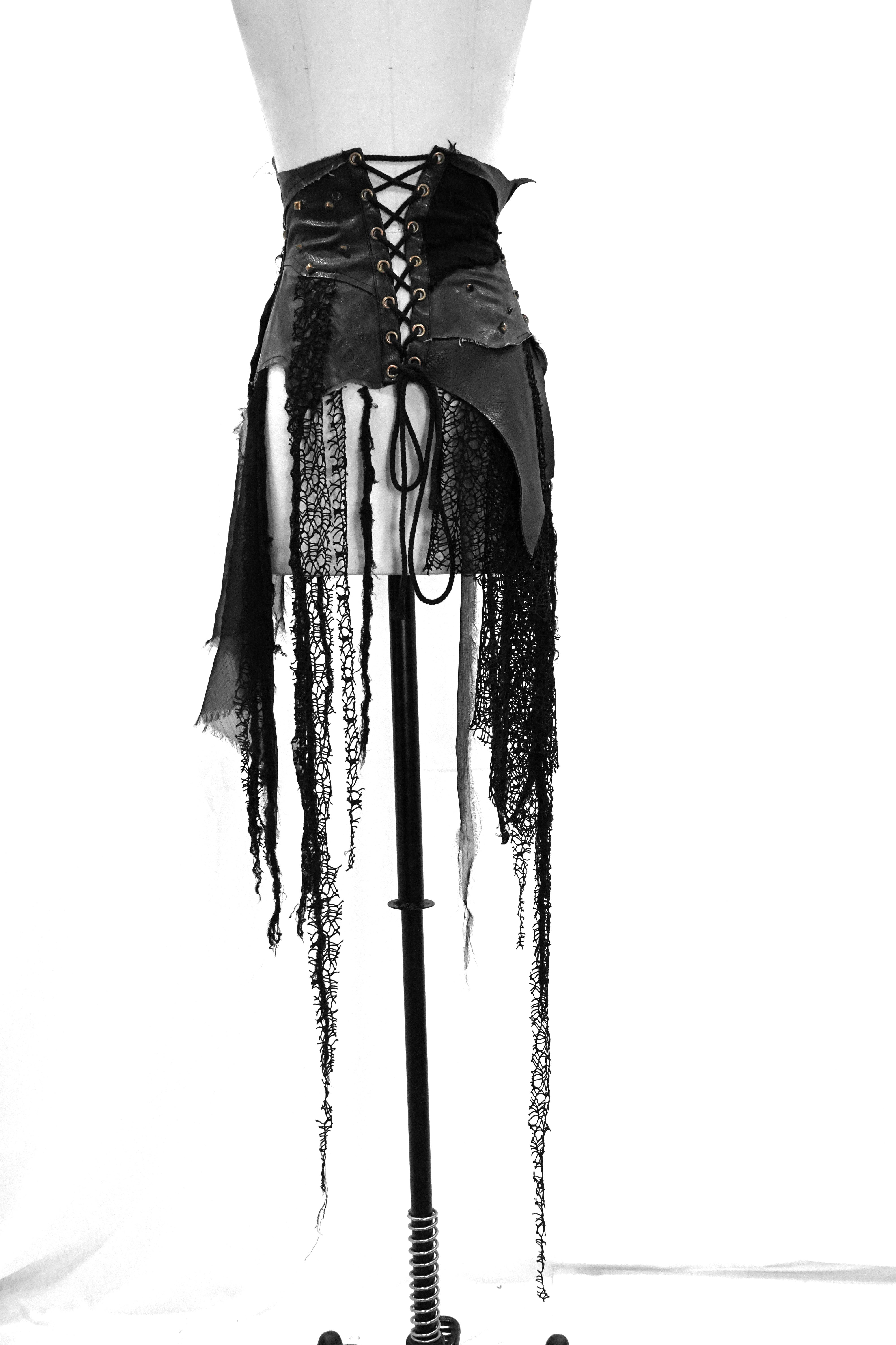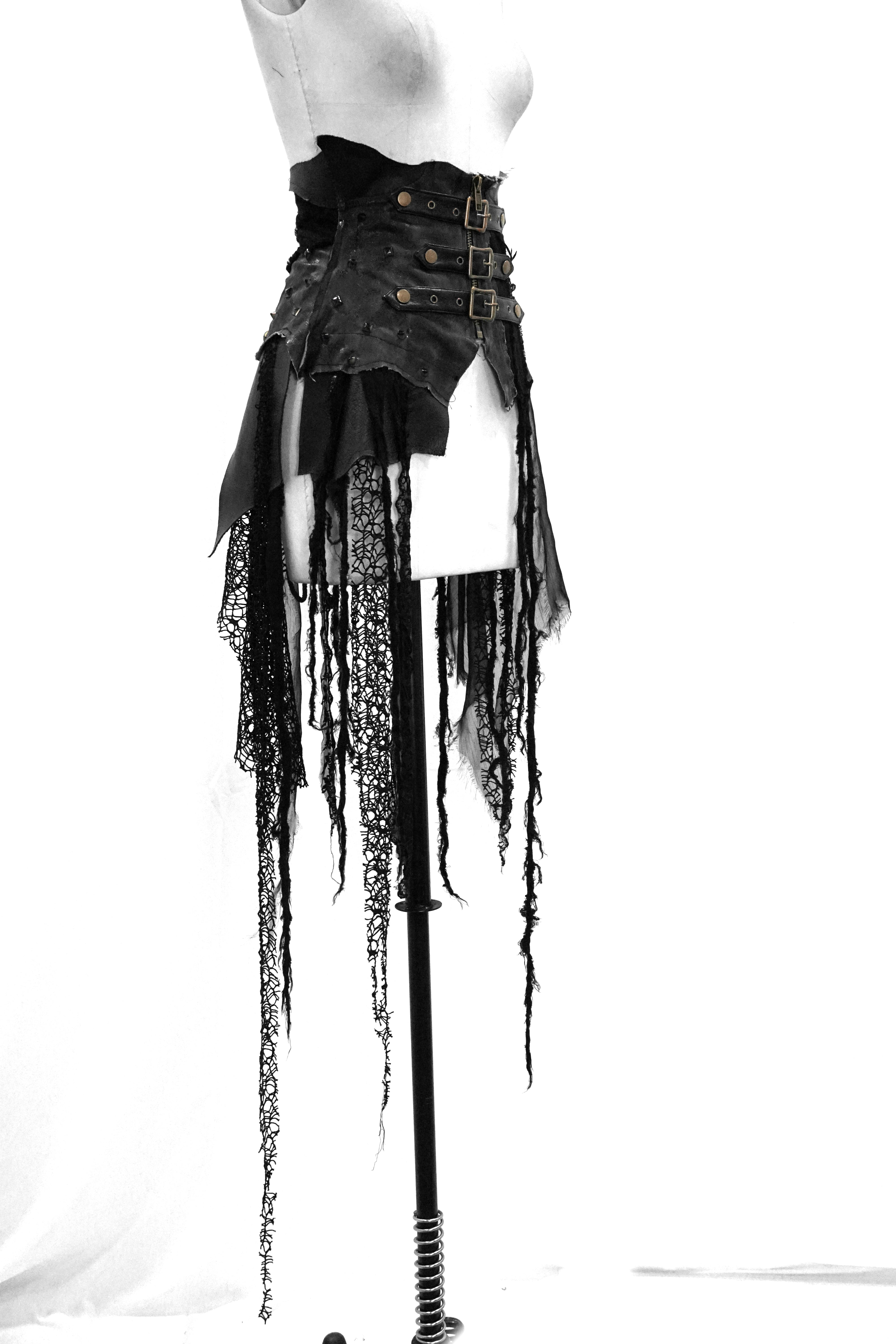 Wasteland Empress Corset Belt shapes the waist with triple buckle closure and distressed faux leather panels, finished with shredded lace drapes for a fierce, post-apocalyptic layered look.