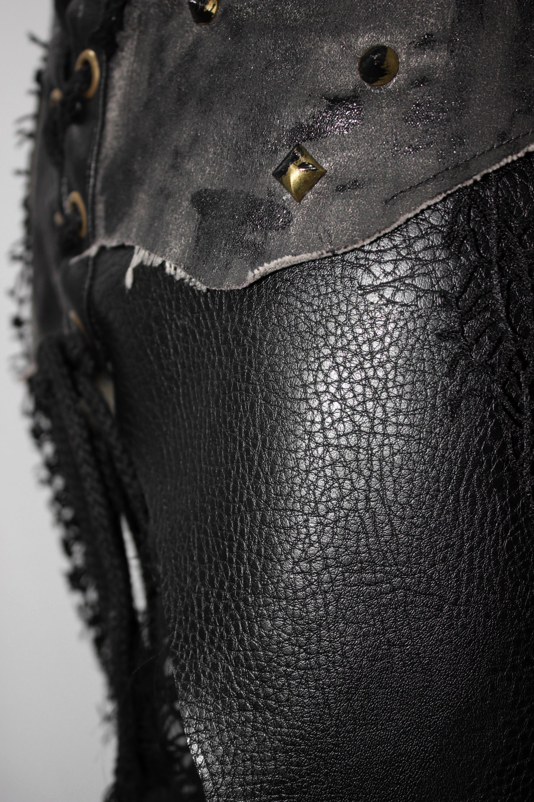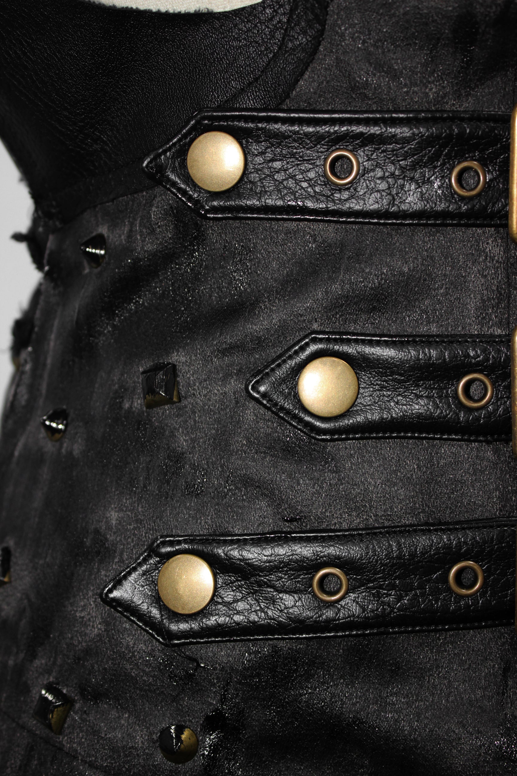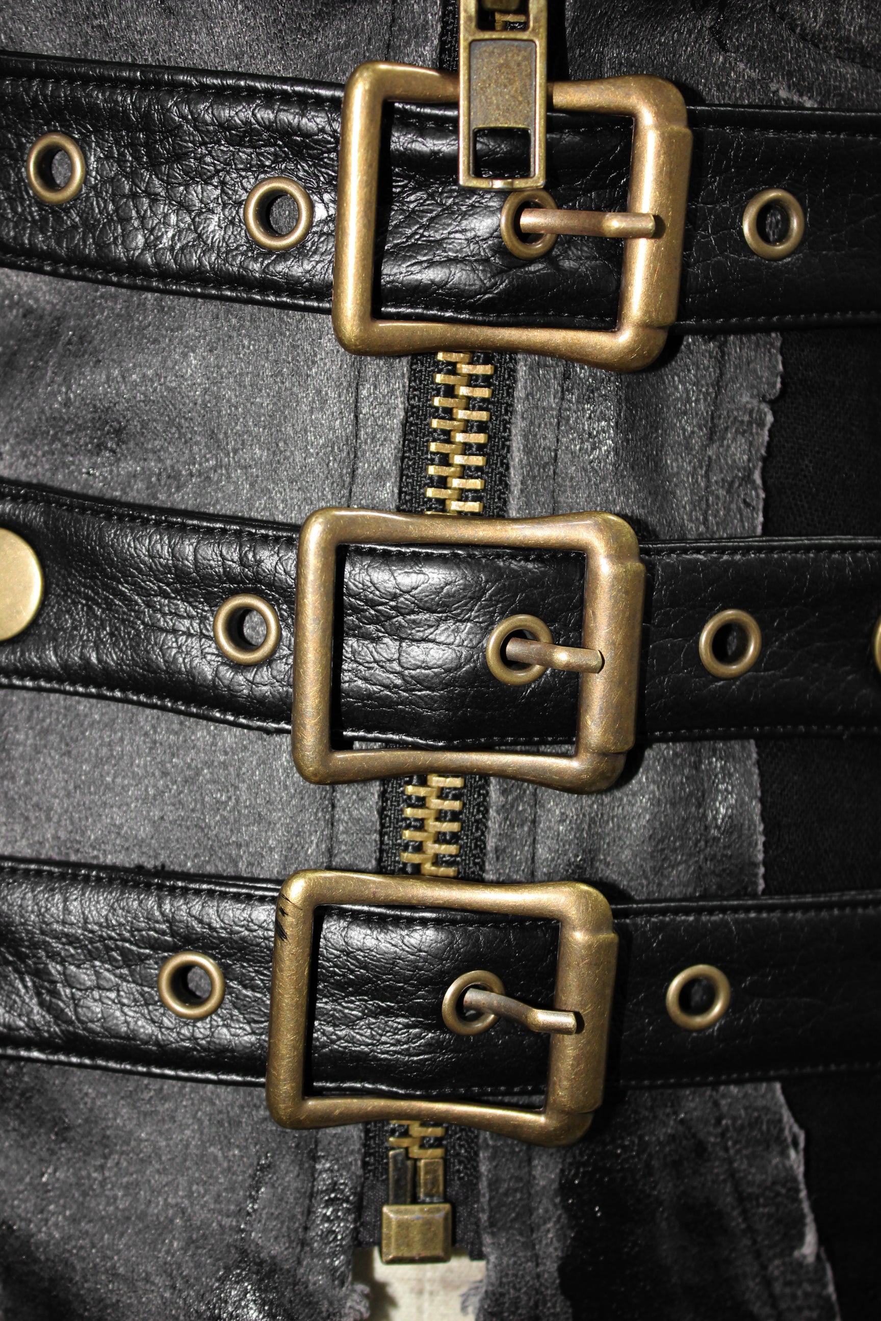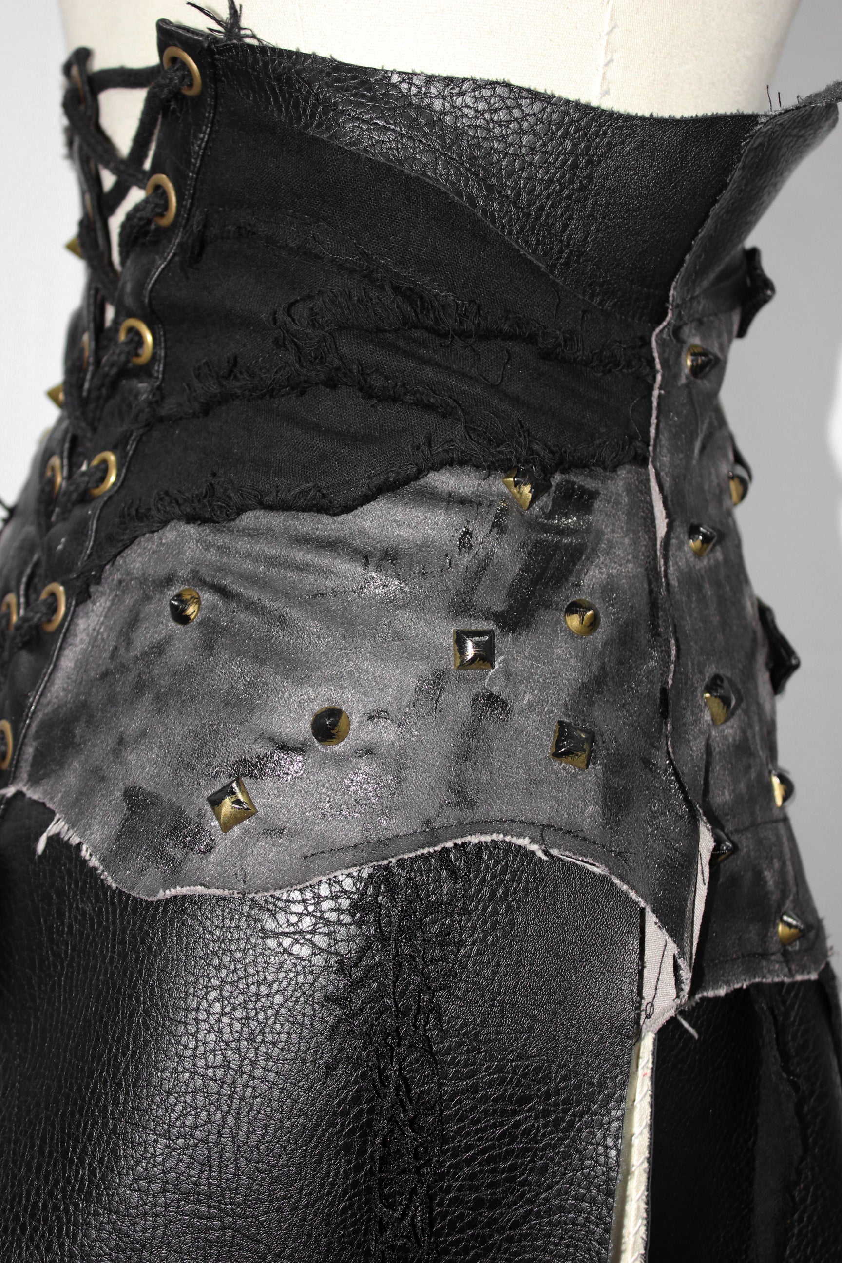 Wasteland Empress Corset Belt shapes the waist with triple buckle closure and distressed faux leather panels, finished with shredded lace drapes for a fierce, post-apocalyptic layered look.
