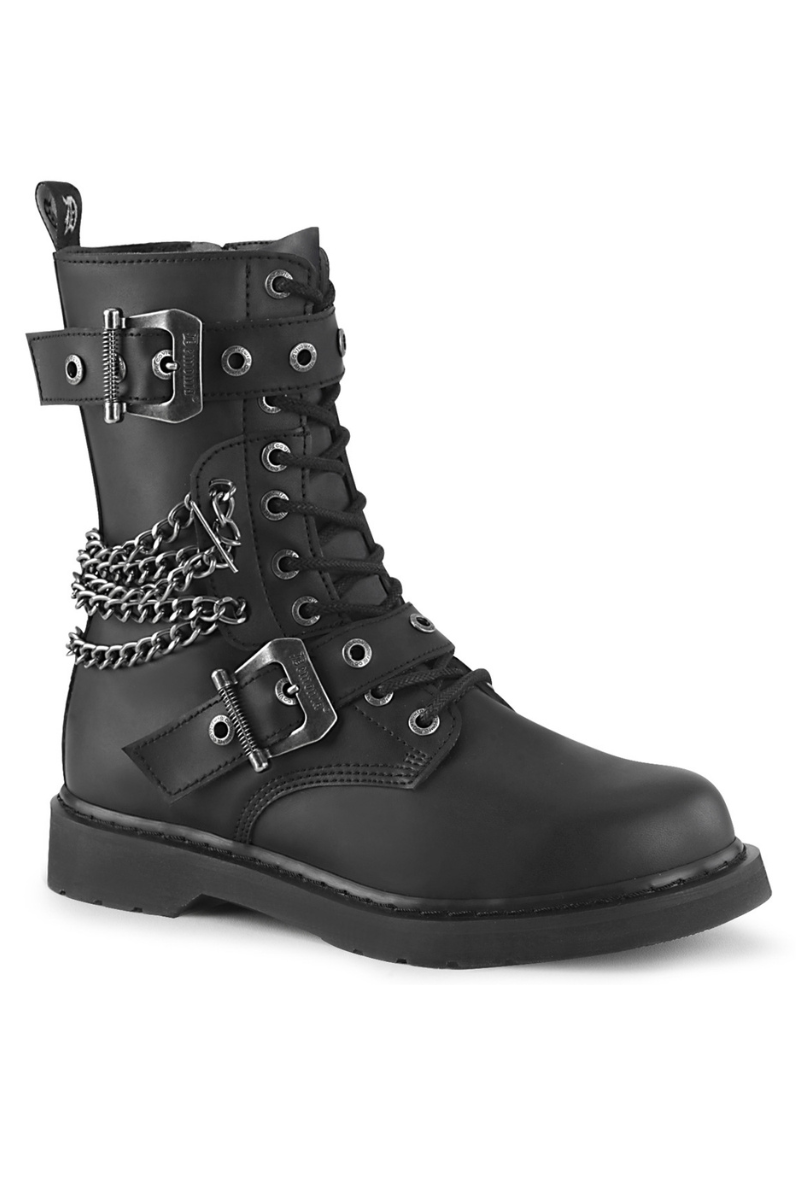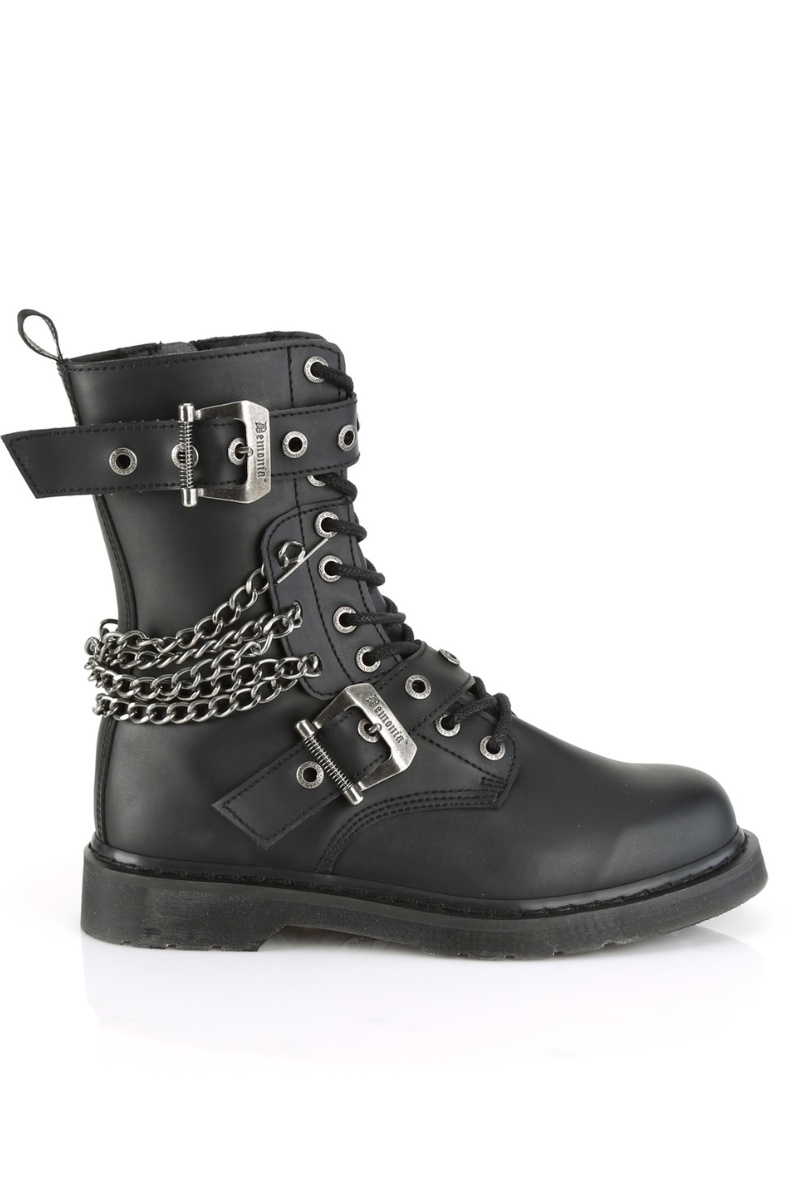 Take no prisoners in the Demonia Bolt-250. These mid-calf combat boots bring chaos with wraparound chains, oversized buckles, and a chunky platform sole. With silver chain adornments and functional buckle straps that also add attitude, this solid boot is great for concerts, goth festivals, or underground gigs!