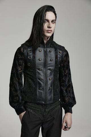 Male model wearing Punk Rave WY-1489 all-black Gothic vest with brocade fabric, faux leather panels, and embossed decorative buttons