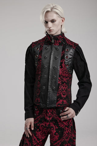 Male model wearing Punk Rave WY-1489 red Gothic vest with black faux leather panels, embossed buttons, and ornate red brocade design