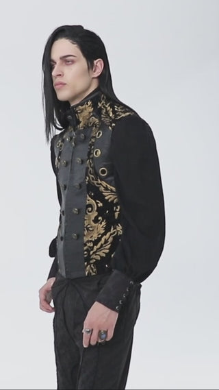 Punk Rave wy-1489 men’s black and gold Gothic brocade zip-up vest with high collar, ornate buttons, and faux leather accents – front view on model.