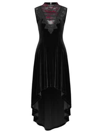 Model wearing punk rave wq-523 a sleeveless red velvet Gothic dress with black lace neckline, high-low hem, and lace-up corset back, photographed on a light background.