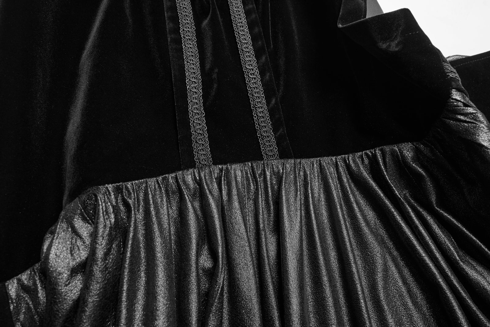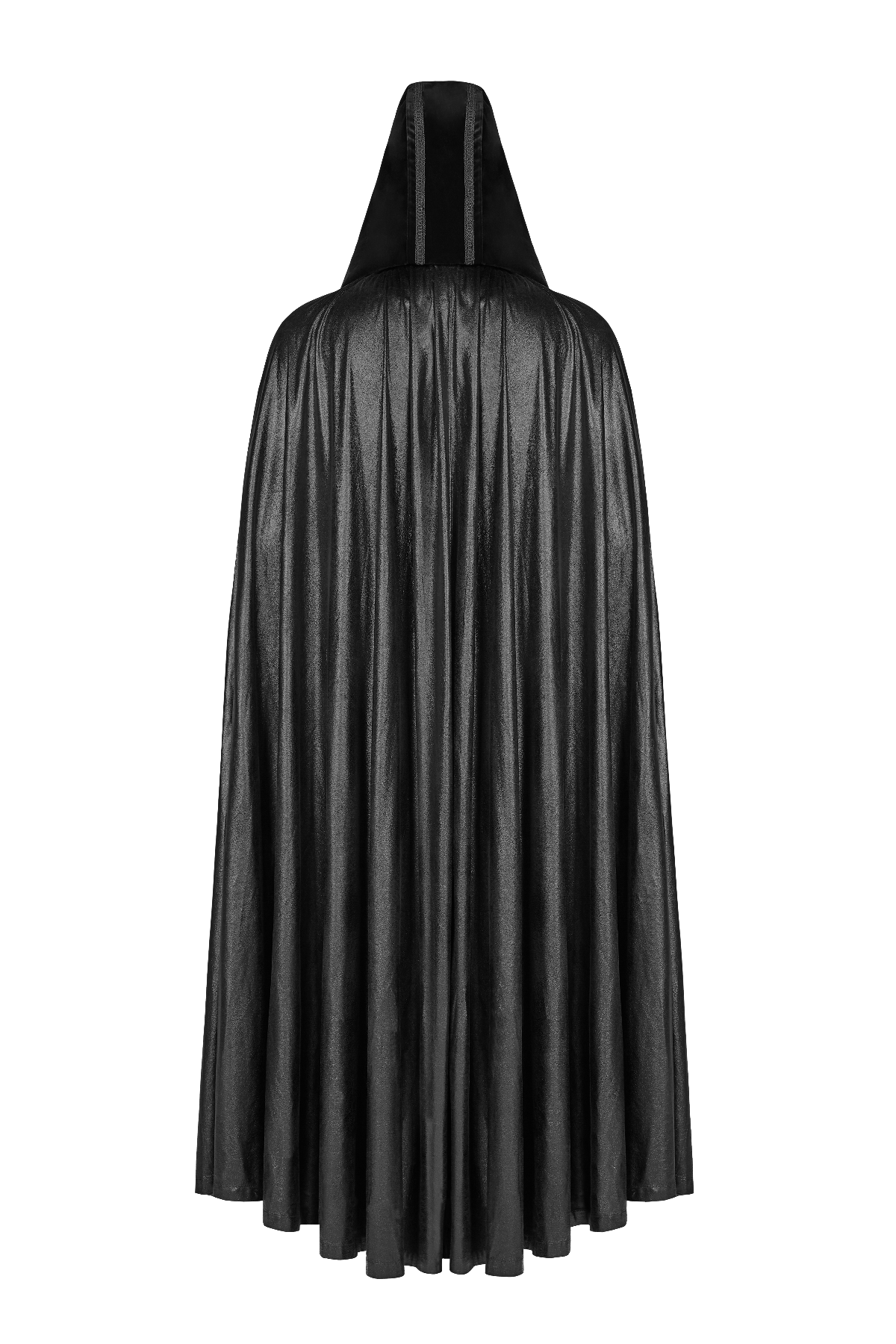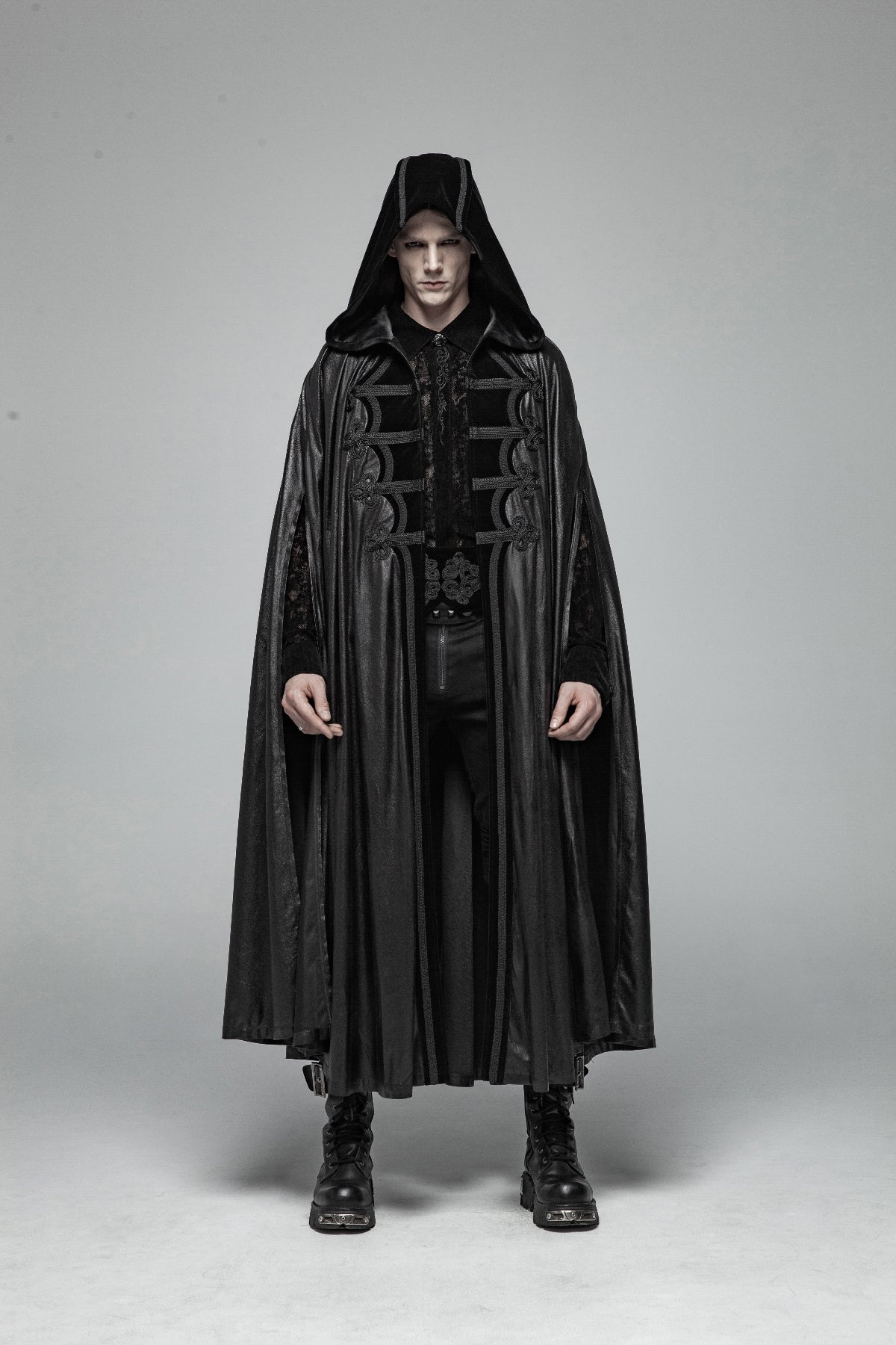 A men’s Vampire Romantic Gothic mantle cloak by Punk Rave, cut in flowing leatherette and velvet, crowned with a vast hood and austere, old-order military ornamentation.