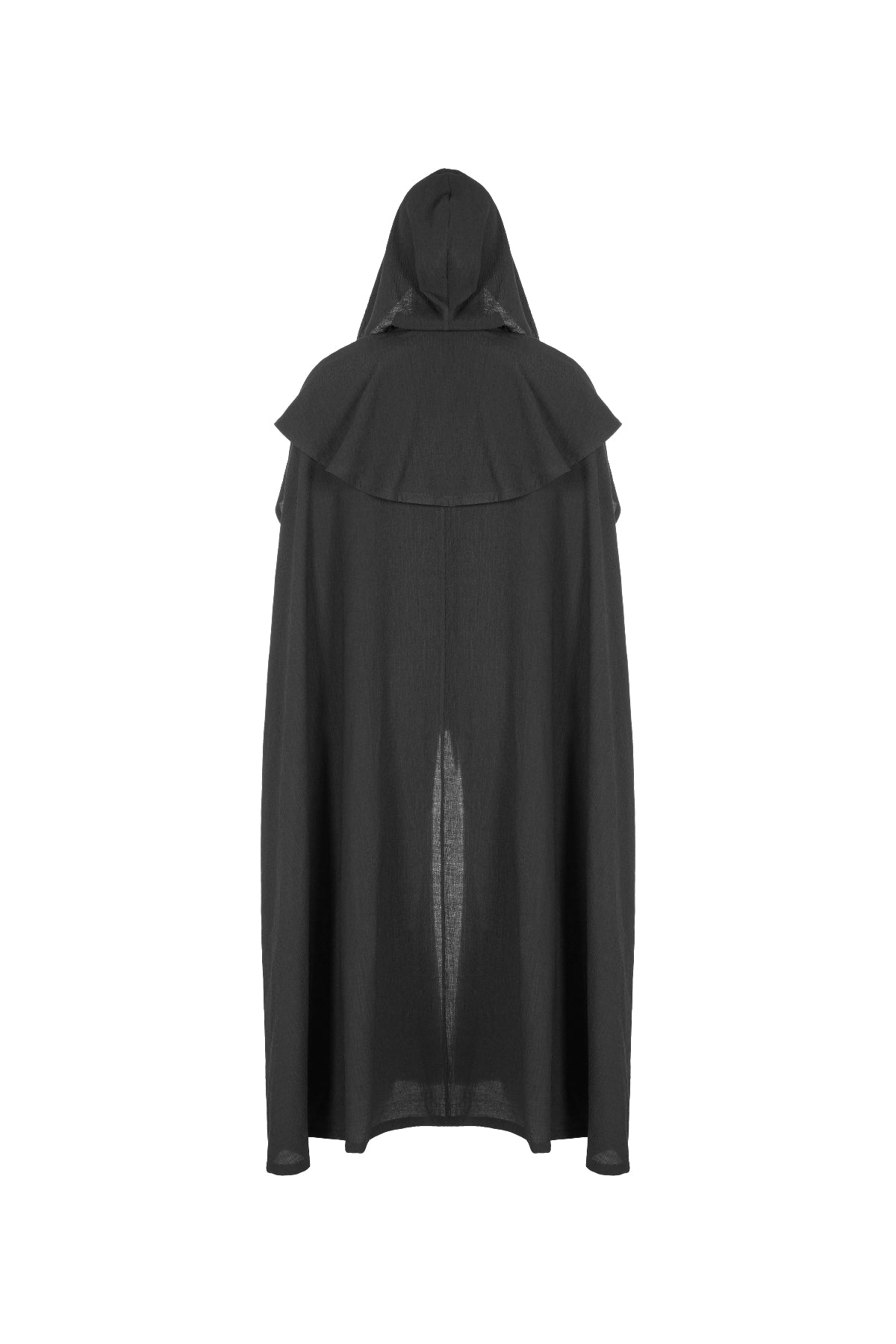 Black Forest Ranger Cloak is a full-length cloak with a deep hood and layered shoulder mantle. It offers full coverage with a traditional front tie closure and a relaxed drape suitable for medieval, fantasy, and cosplay styling.