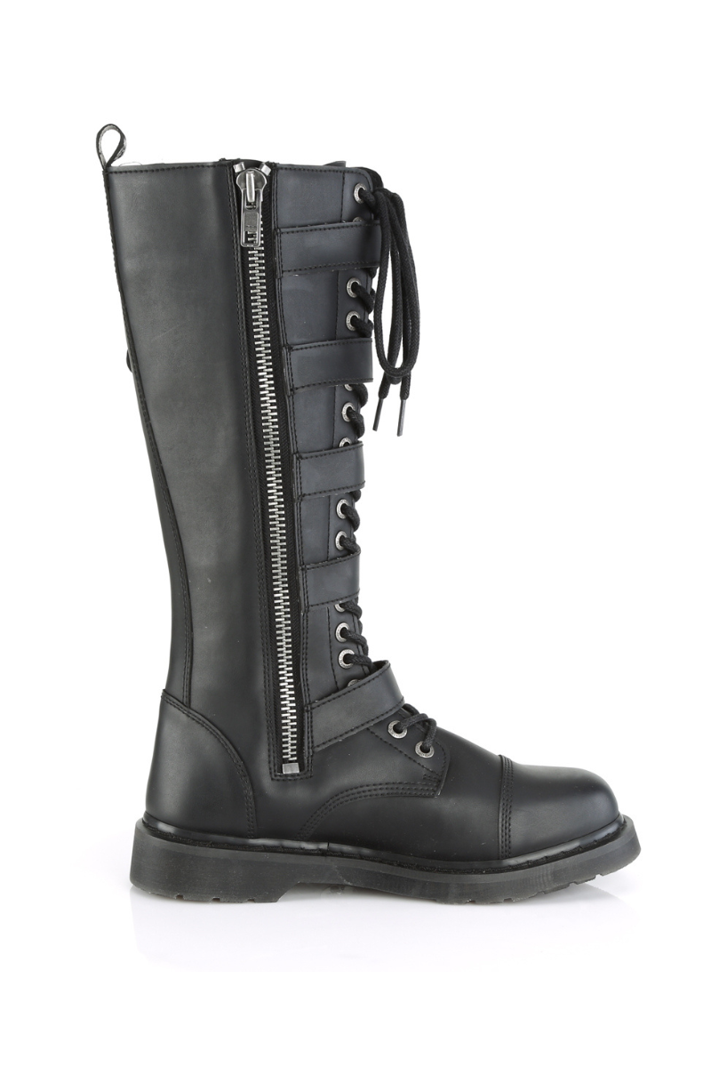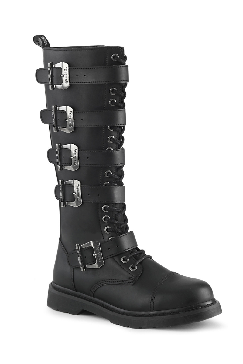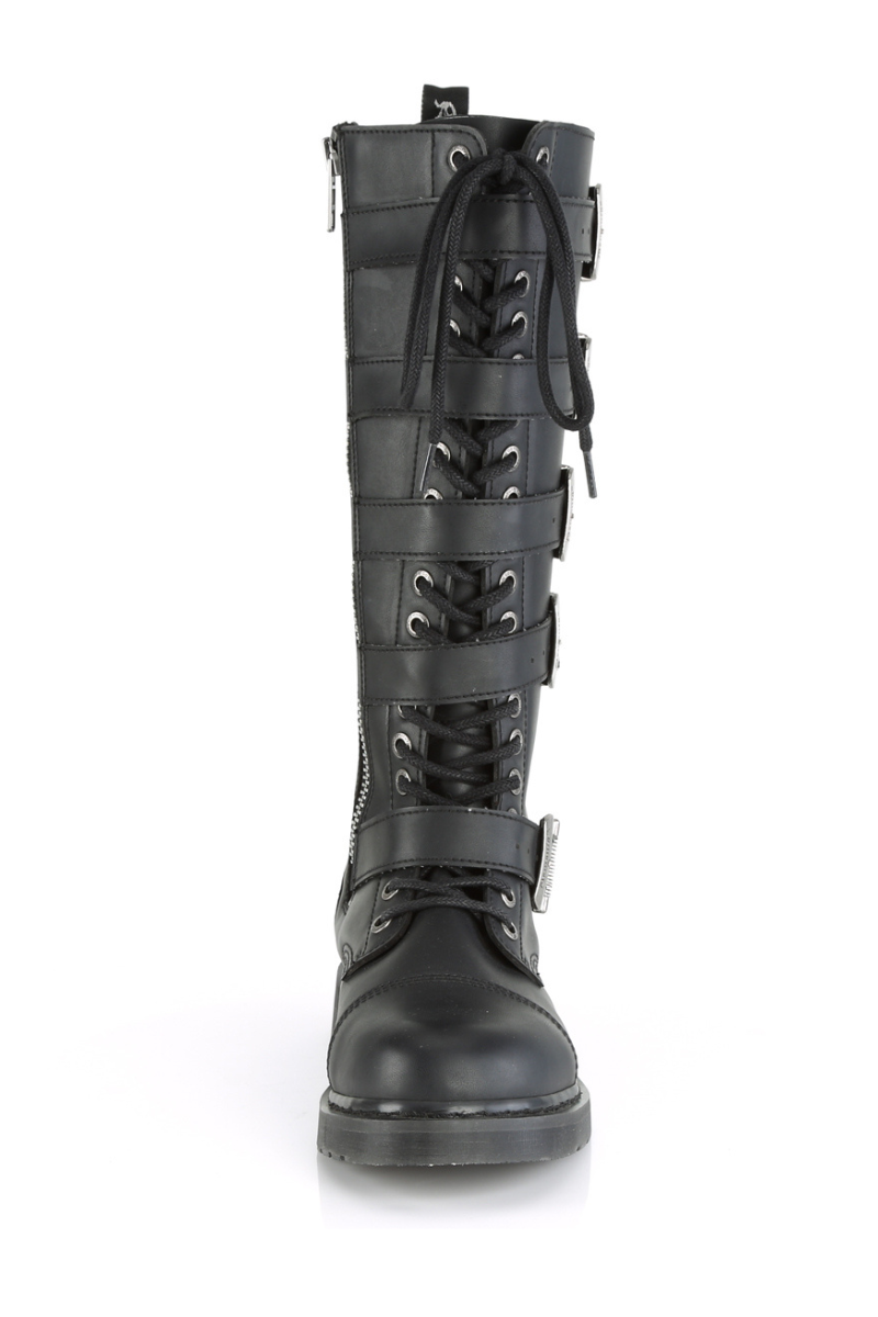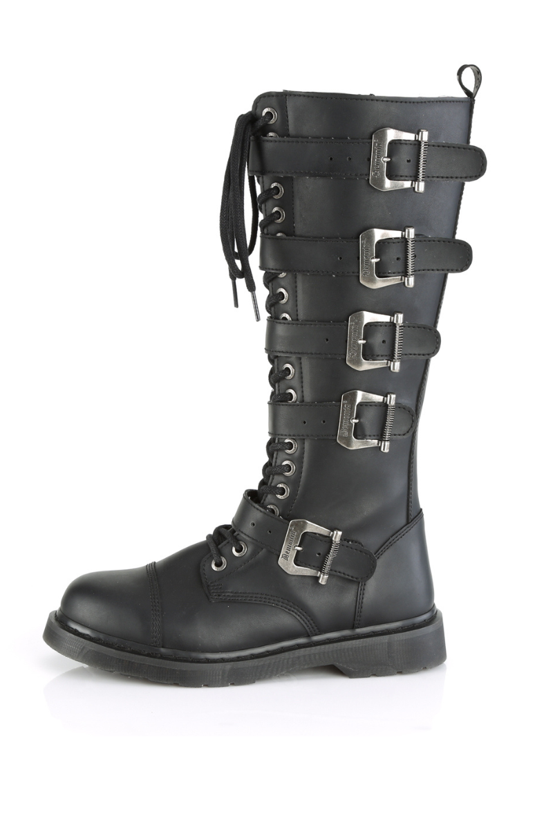 Knee-high combat boots with five buckle straps running up the shaft for a bold industrial look.