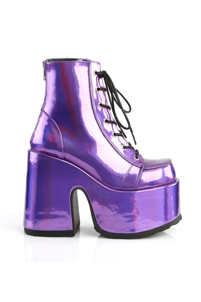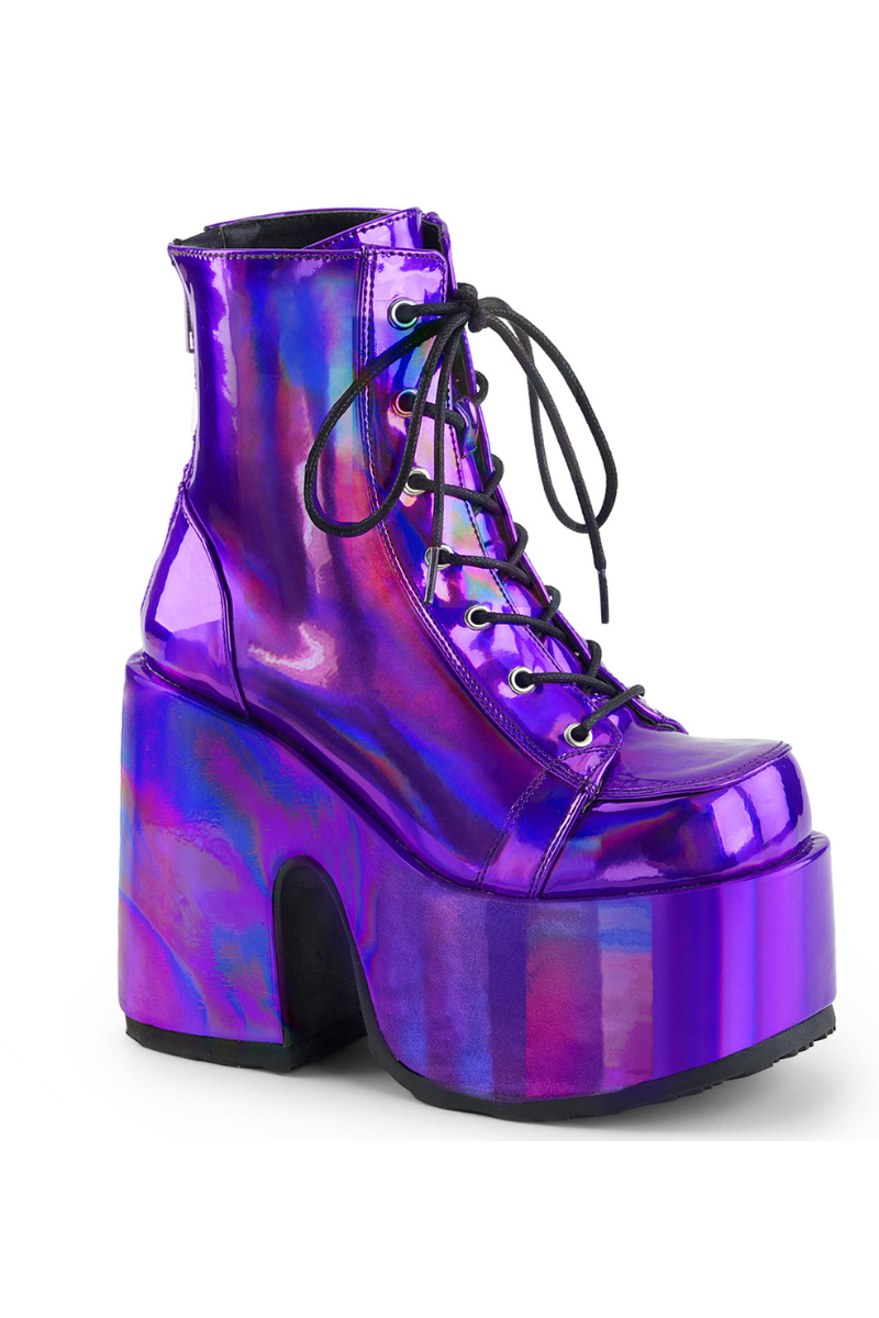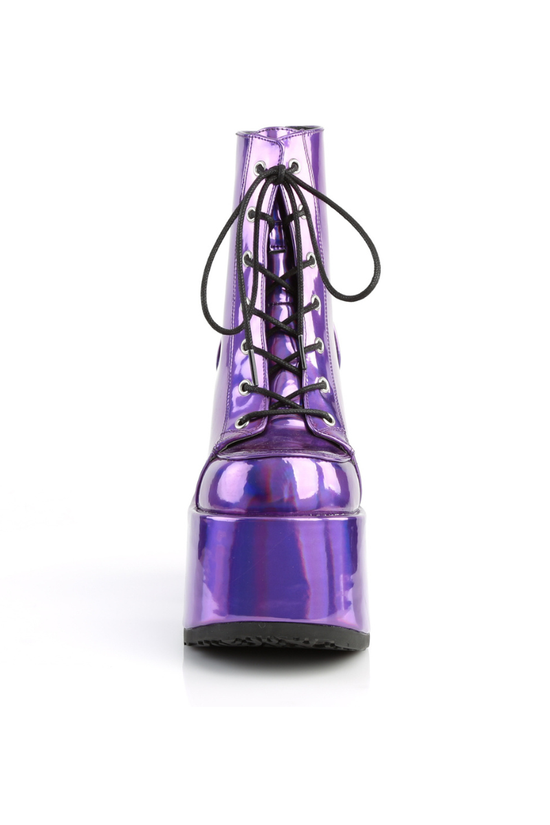 Purple oil-slick platform ankle boots with a chunky heel and wide base, designed as a bold visual statement with a high-shine finish.