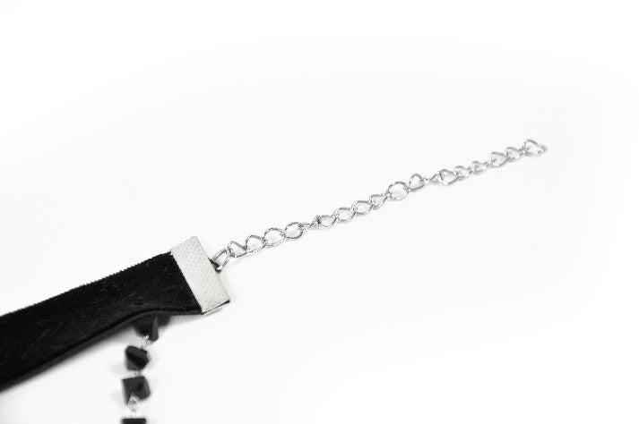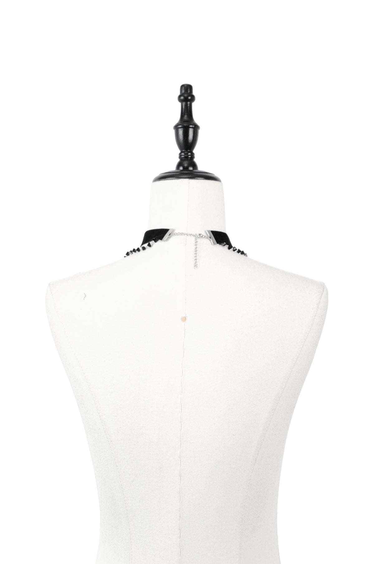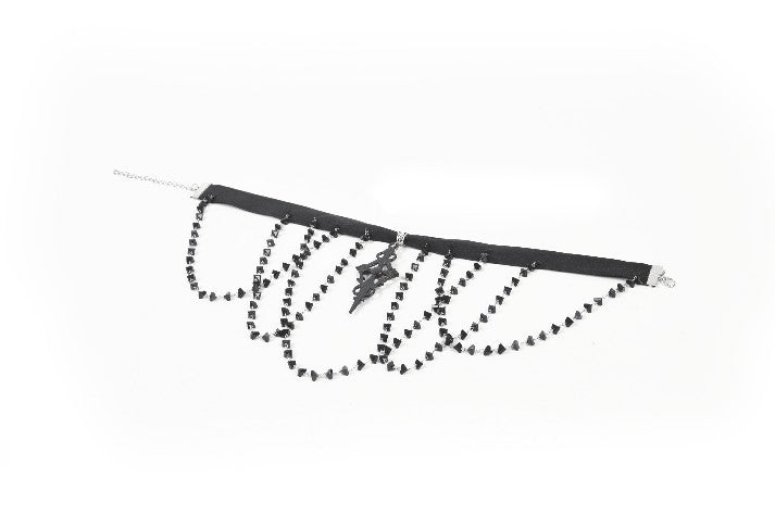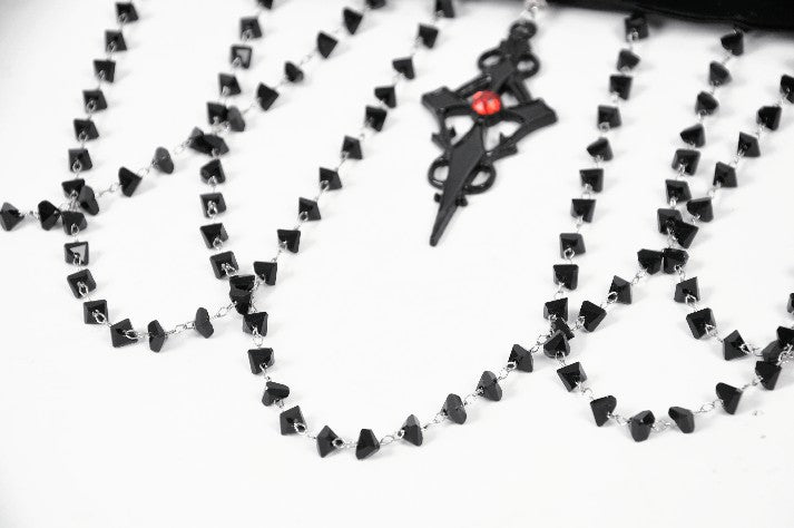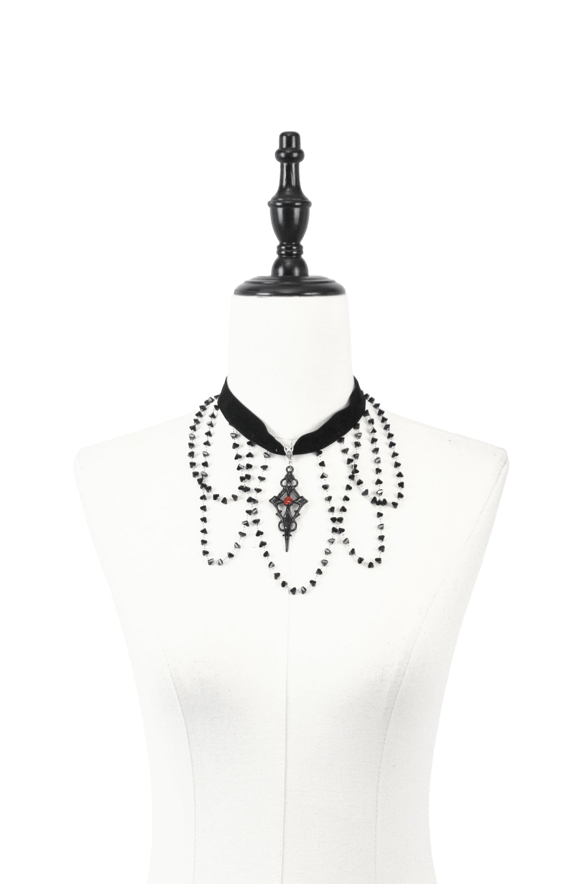 A dramatic black velvet choker draped with cascading beads and a crimson cross pendant — perfect for Gothic soirées, vampire balls, or pairing with corset gowns and dark romance dresses.