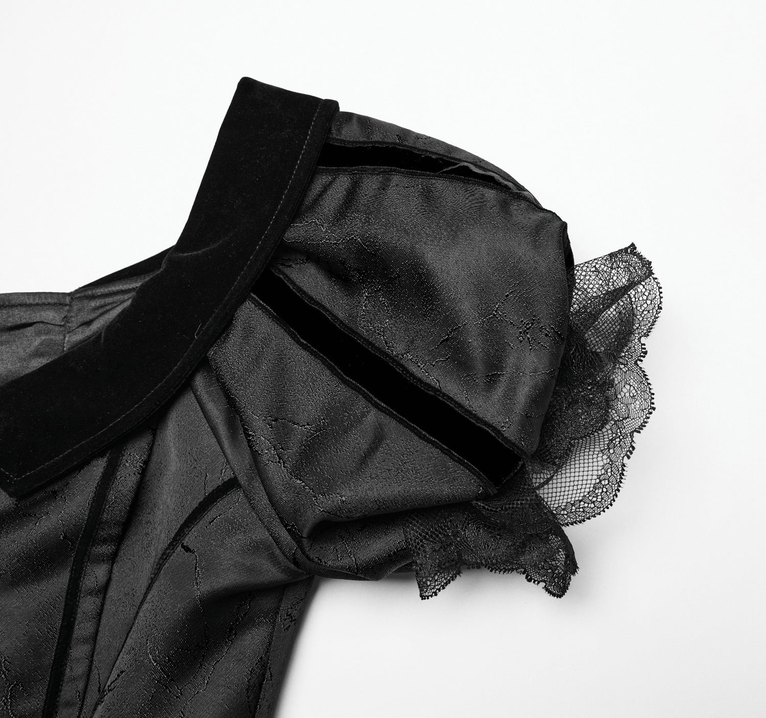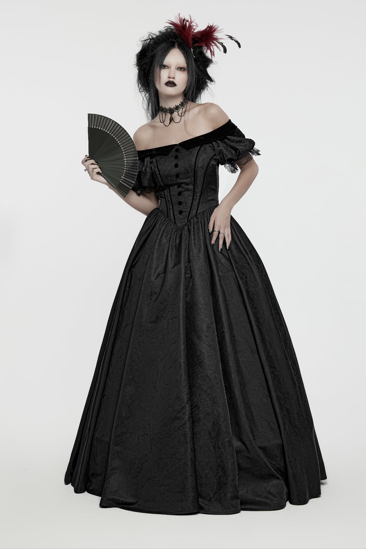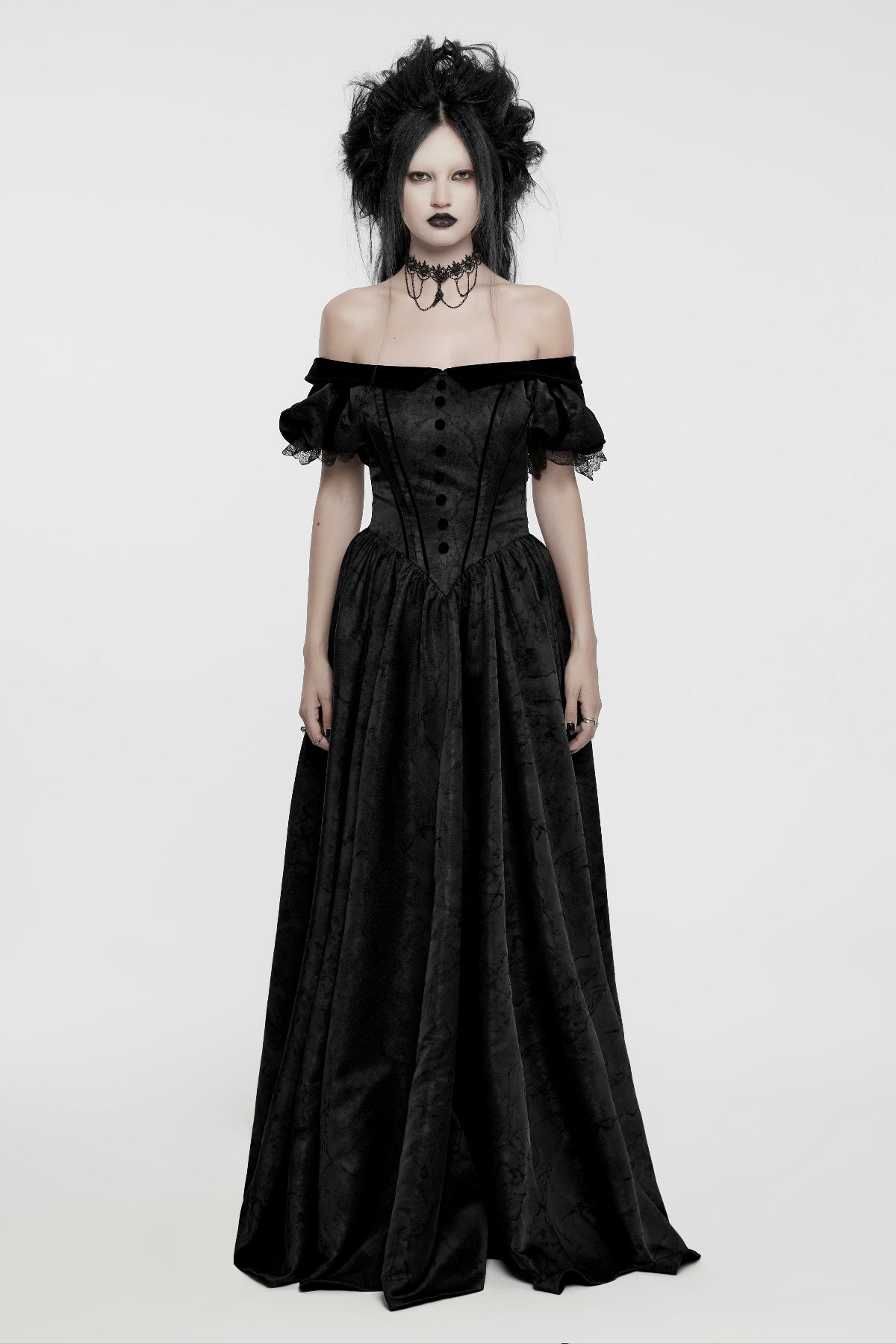 This Victorian Gothic long dress fits fitted and structured through the bodice with a regular-size cut and no stretch. The woven fabric holds its shape firmly at the waist before falling into a full-length skirt.