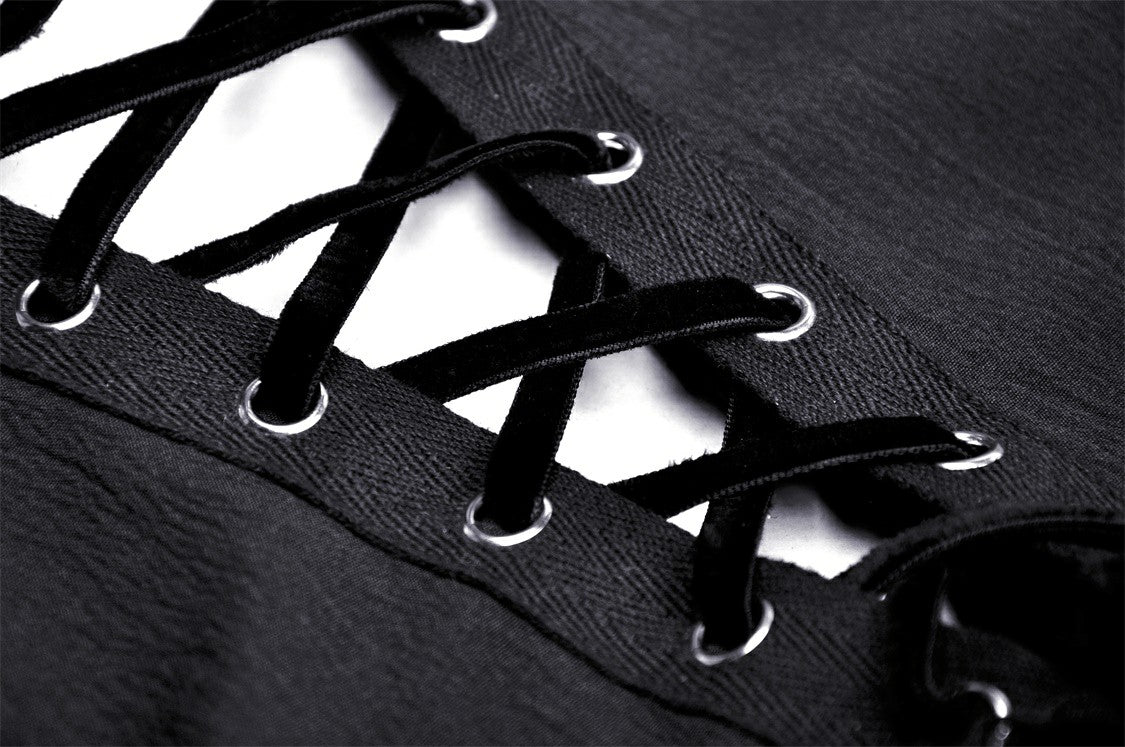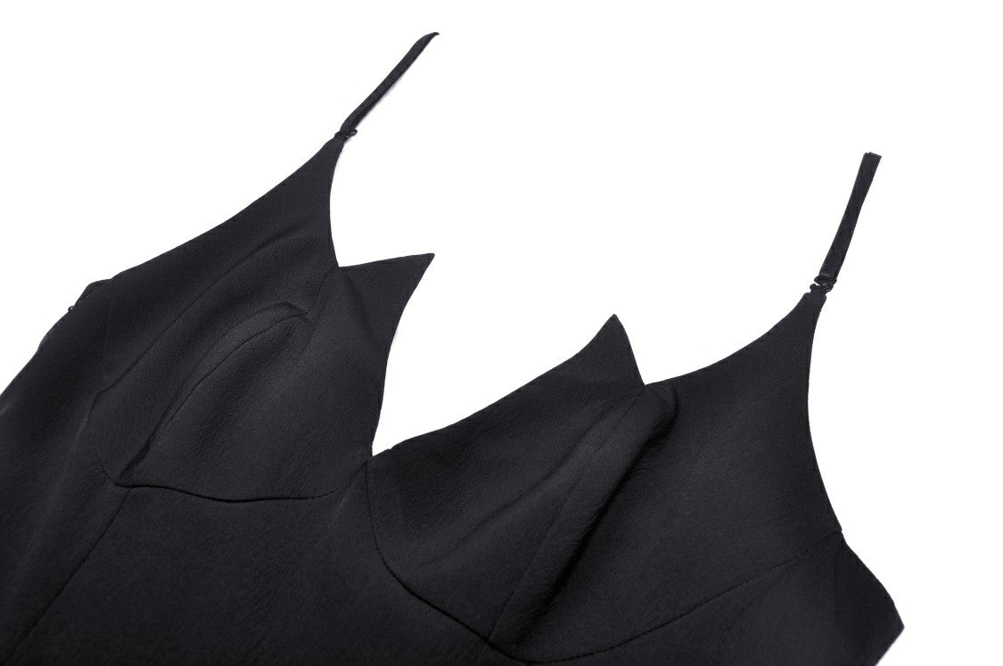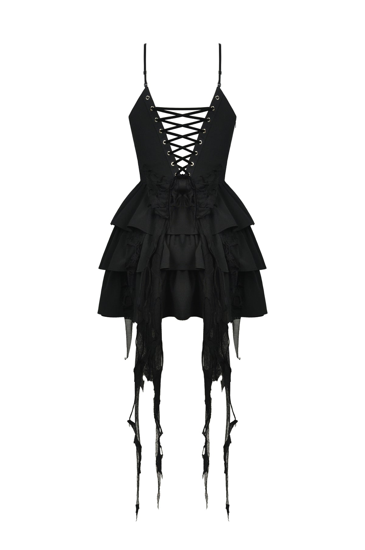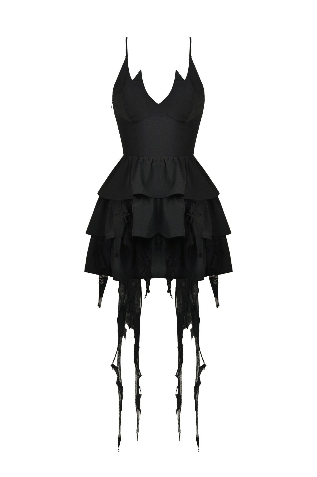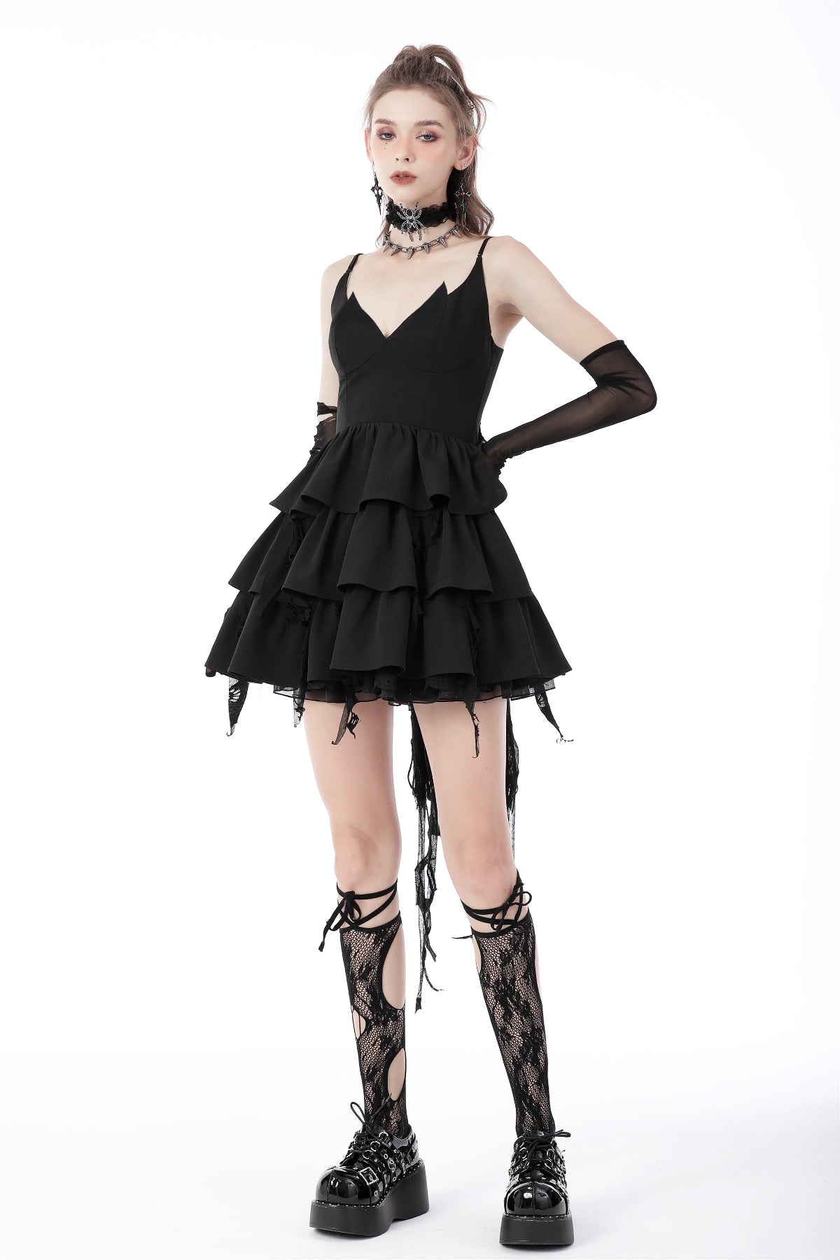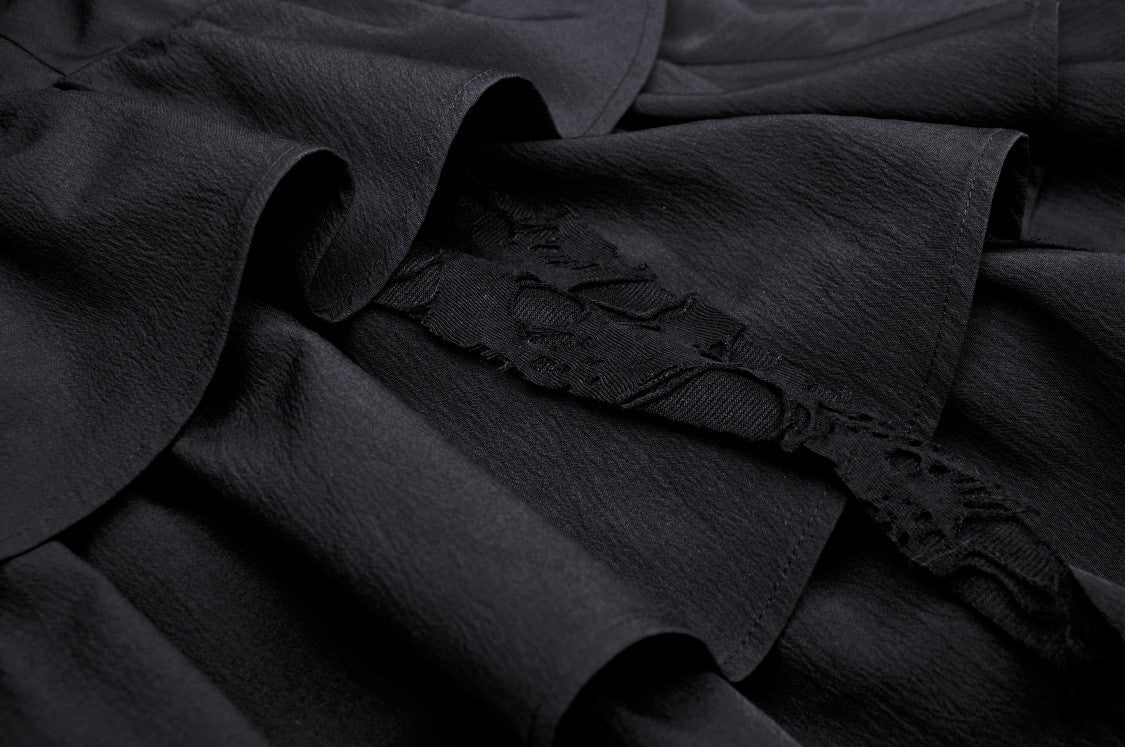 A Romantic Gothic black ruffle dress with a fit-and-flare cut and a low pointed neckline.