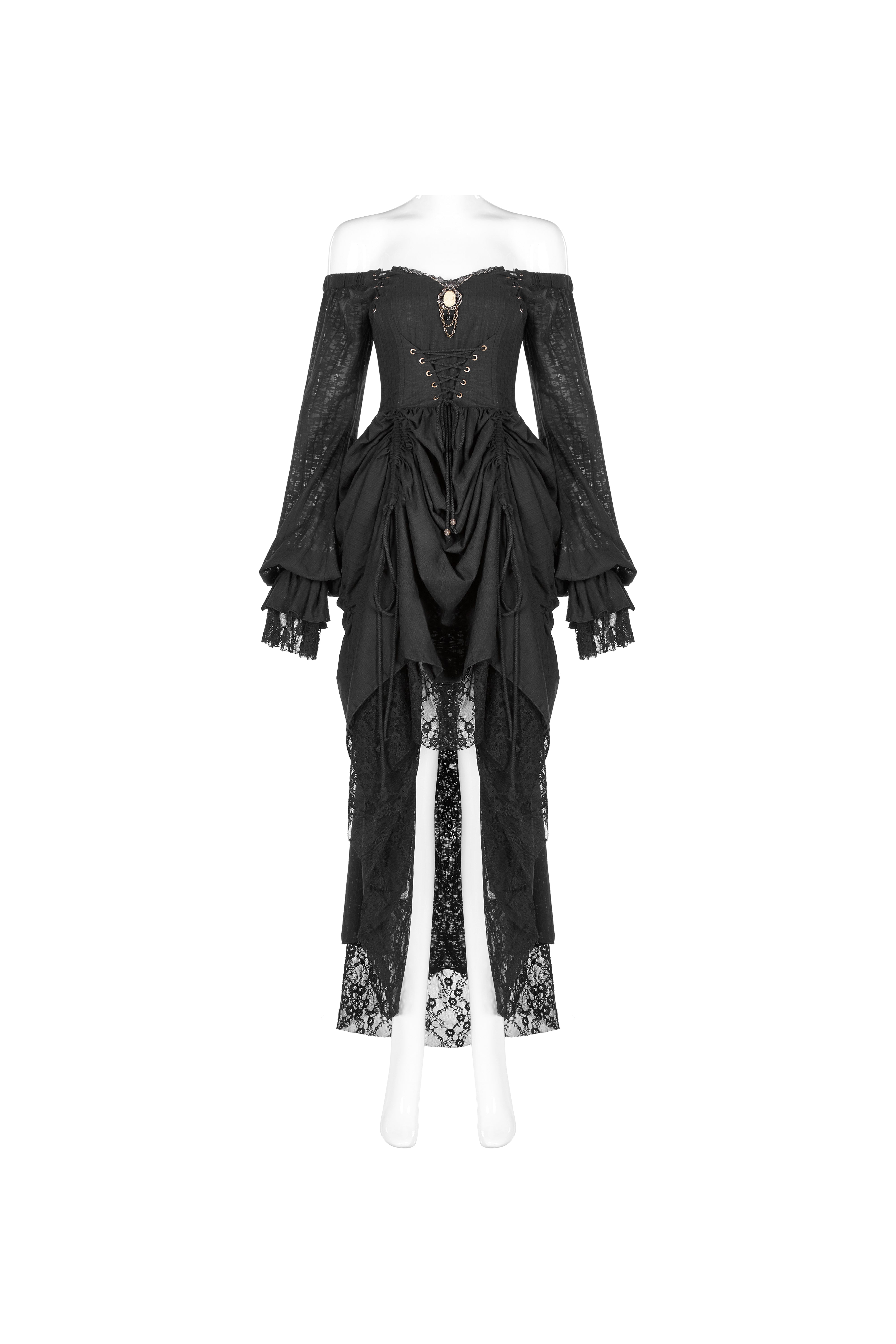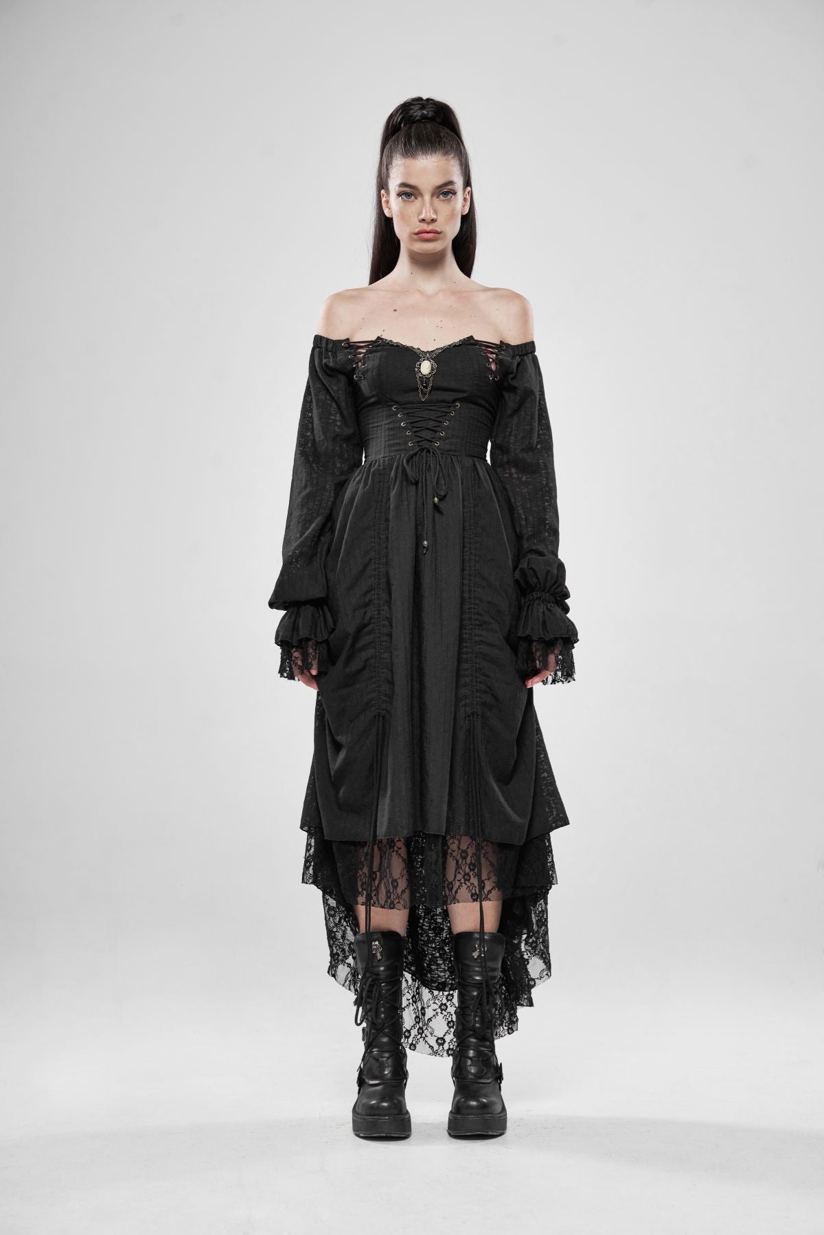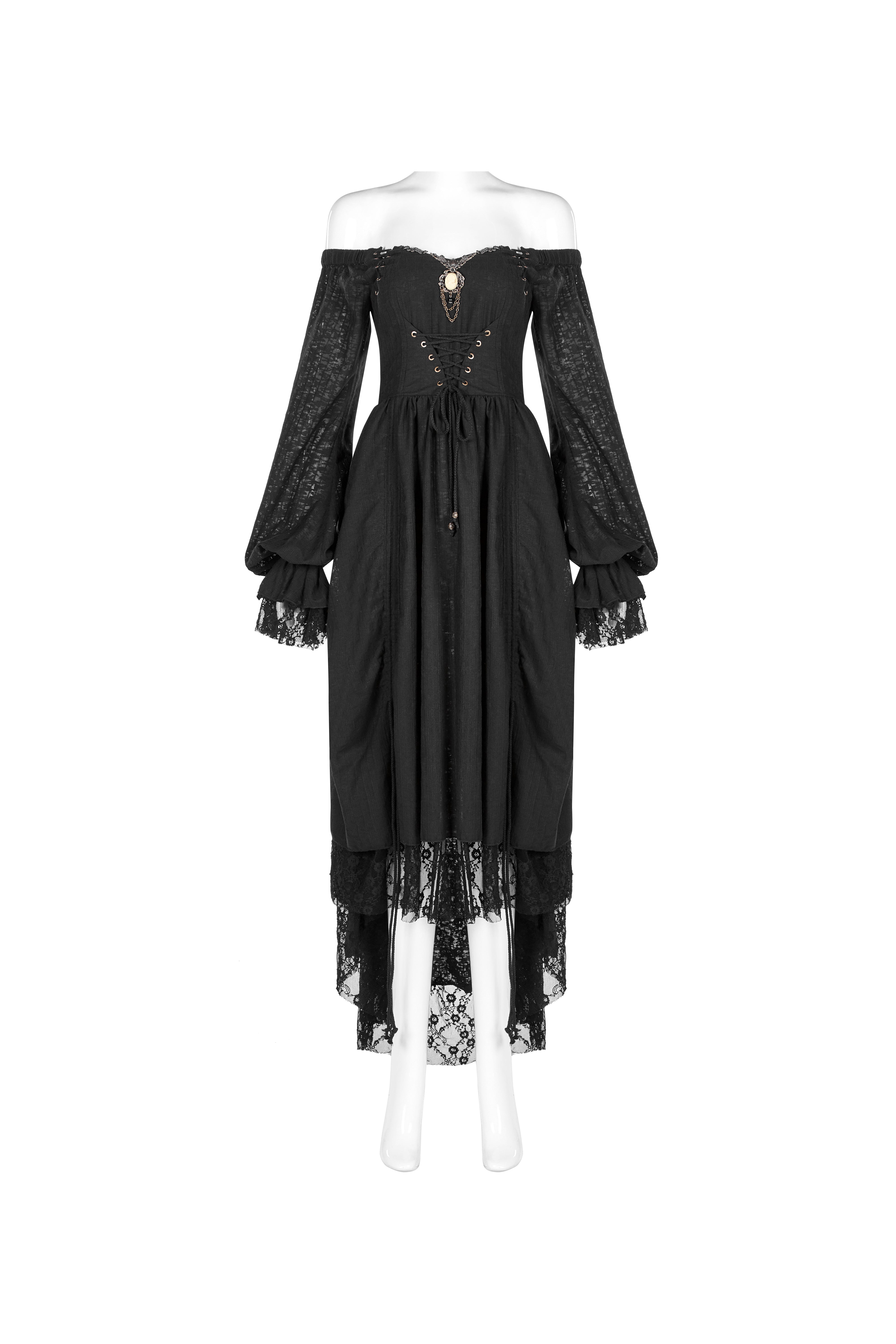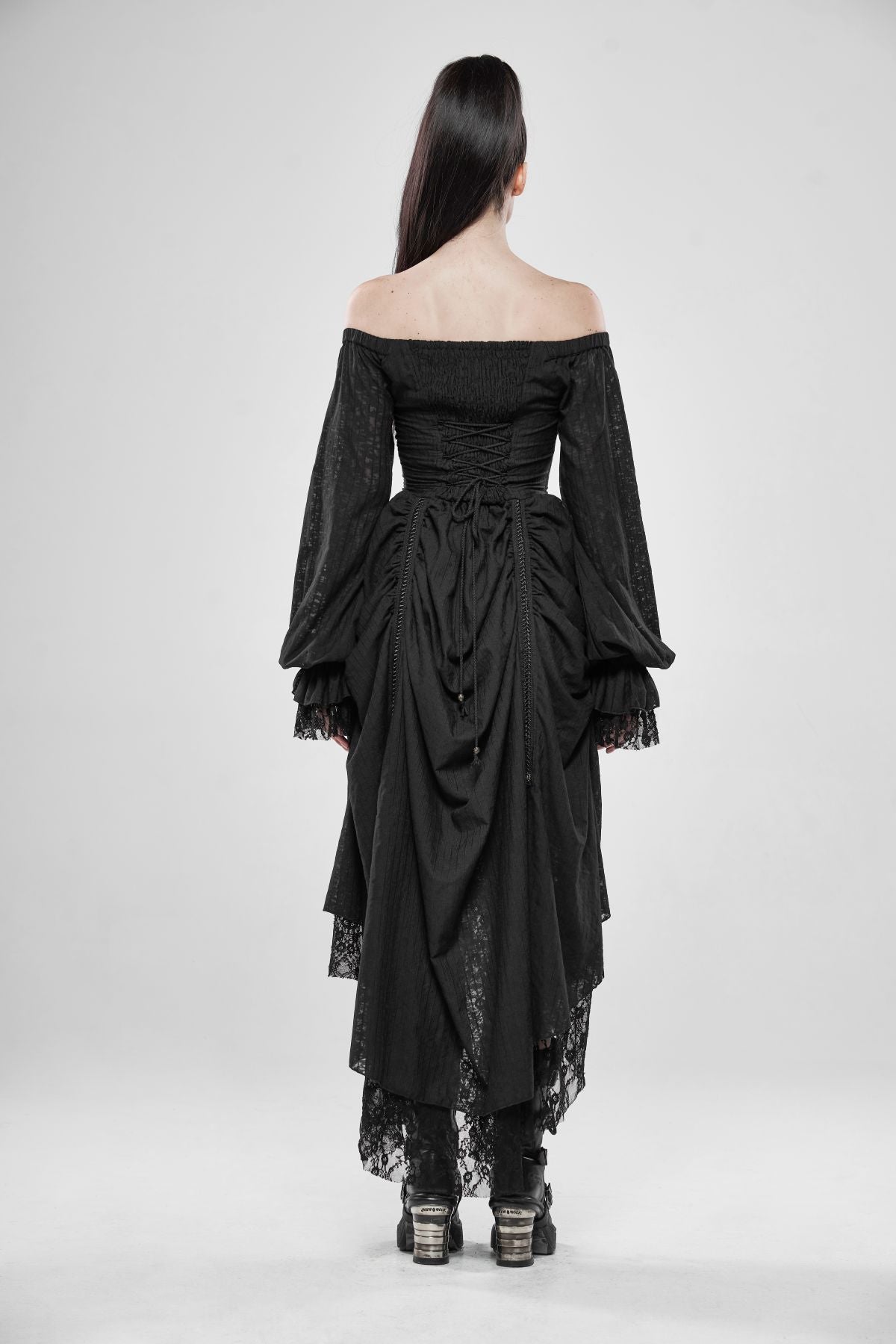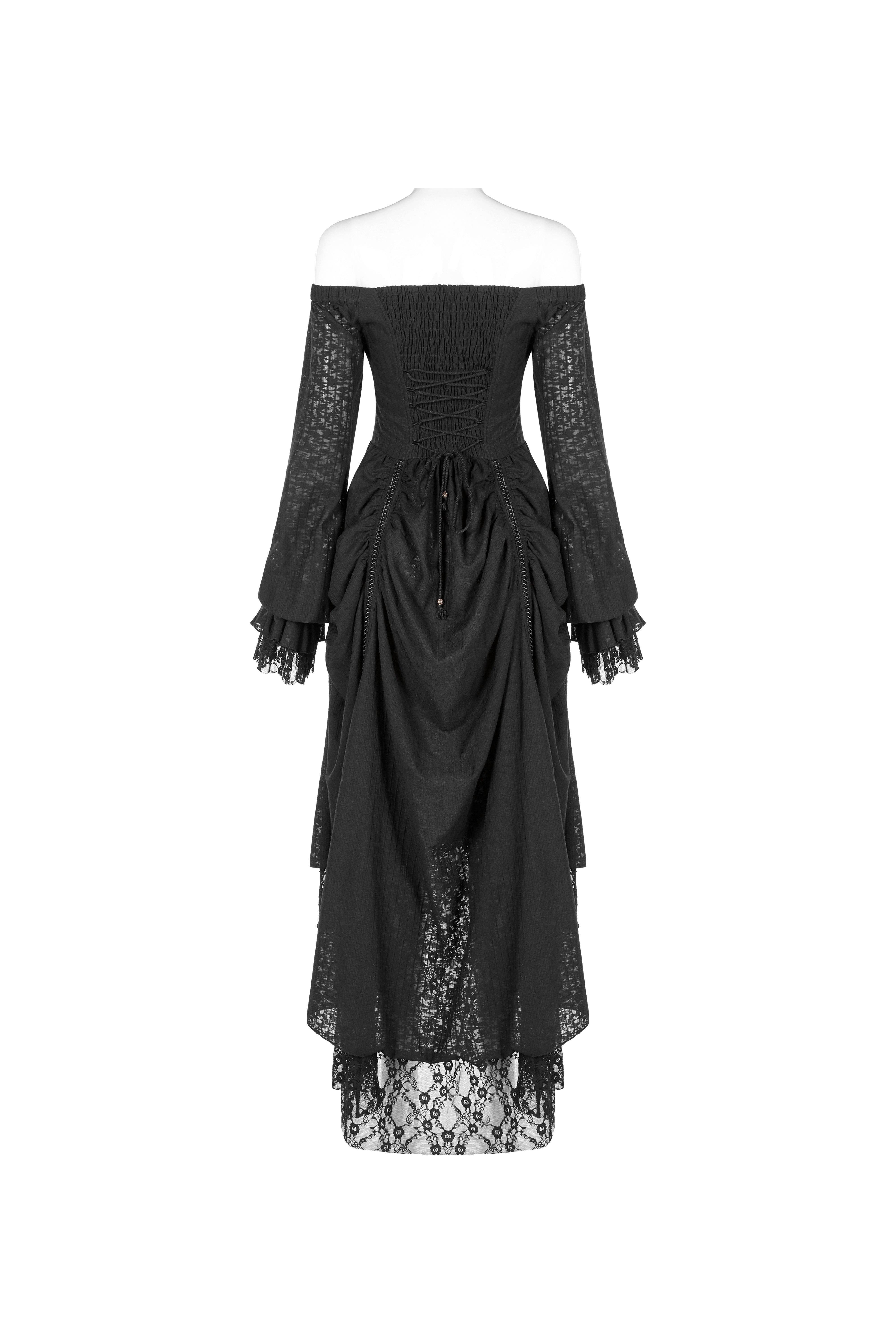 A black gothic dress with an elegant off-shoulder bridal silhouette and Victorian structure. The lace-up bodice shapes the waist while the adjustable layered skirt creates flowing movement.