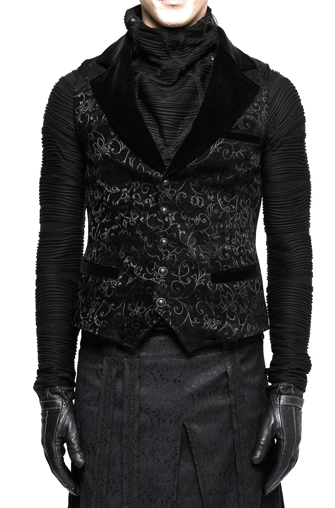 Black with a brocade design making this vest anything but ordinary, the addition of the non-functional pockets, wide plain black collars and intricately detailed silver buttons means this vest can be worn to compliment a variety of your style explorations. Wear under a coat or on its own over a shirt and let the design and cut become a focal point you’ll love to showcase!