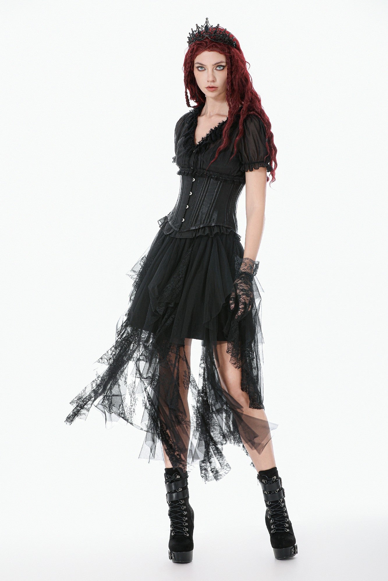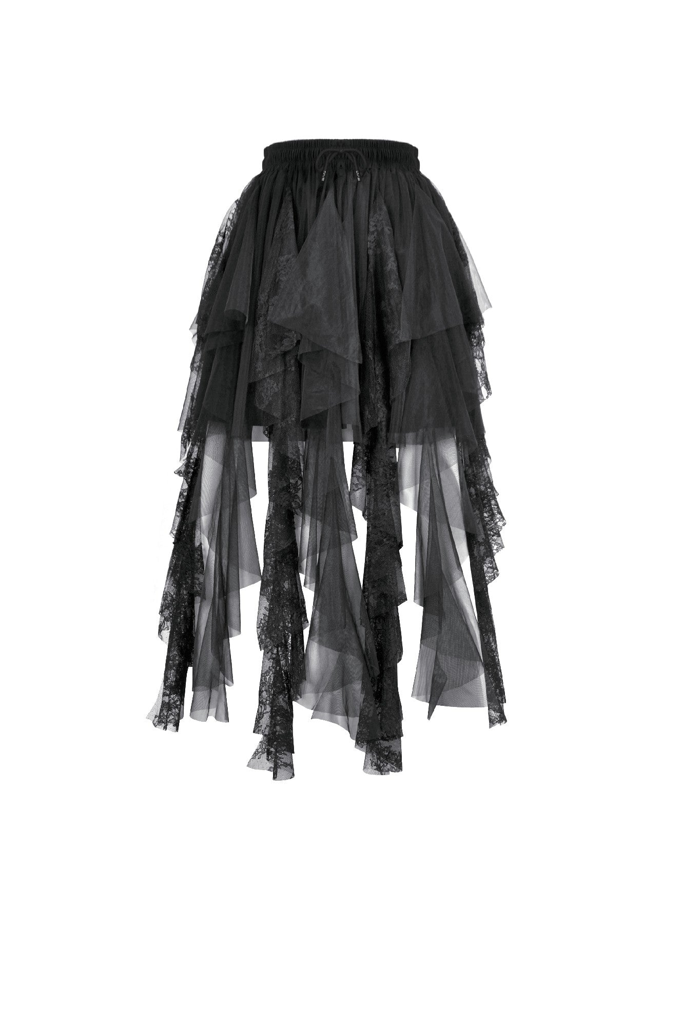 High-low lace skirt with uneven layered panels that hang independently, creating a broken hemline.