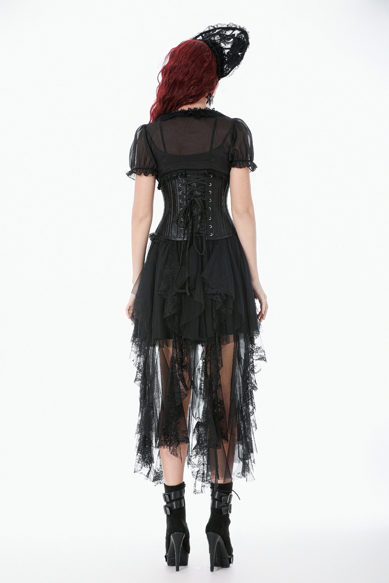 Sheer sections expose the legs while heavier lace adds weight, giving the skirt a drifting, irregular fall when worn.