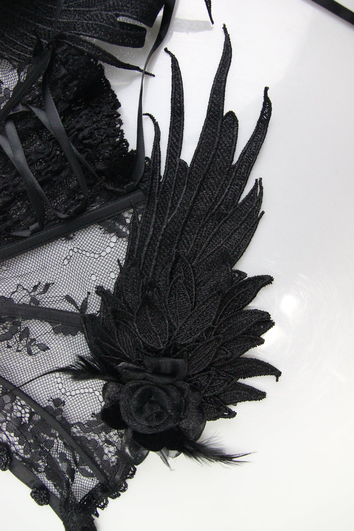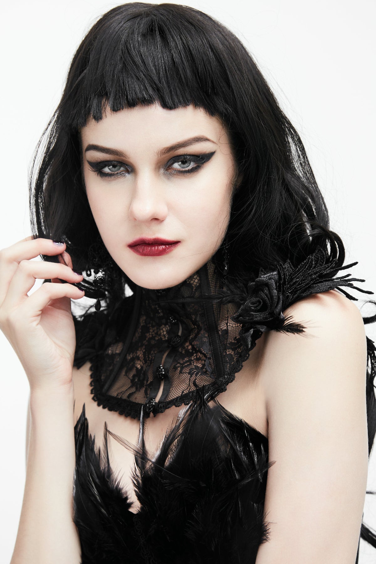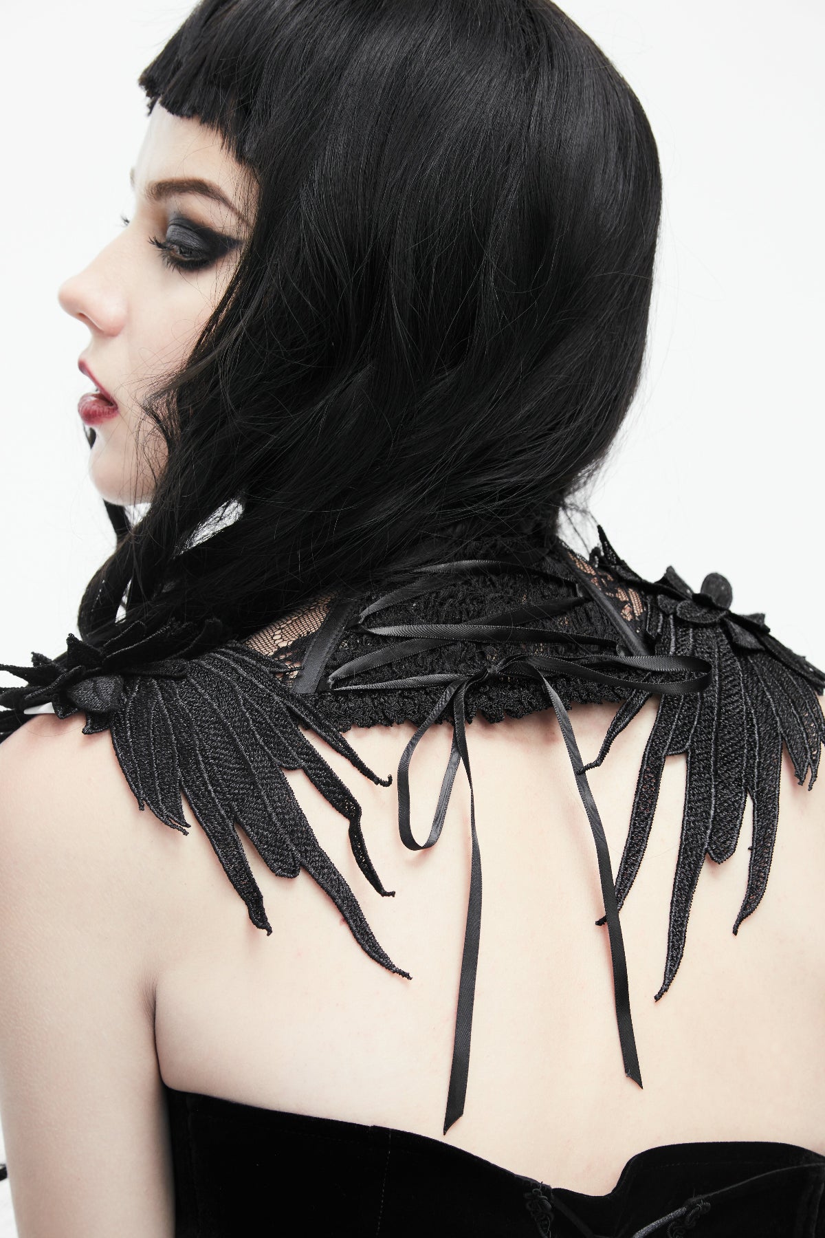 Black Raven neck corset sits high on the collarbone and shapes the neckline like a structured choker, fastening at the front and adjusting at the back for a secure, sculpted fit.