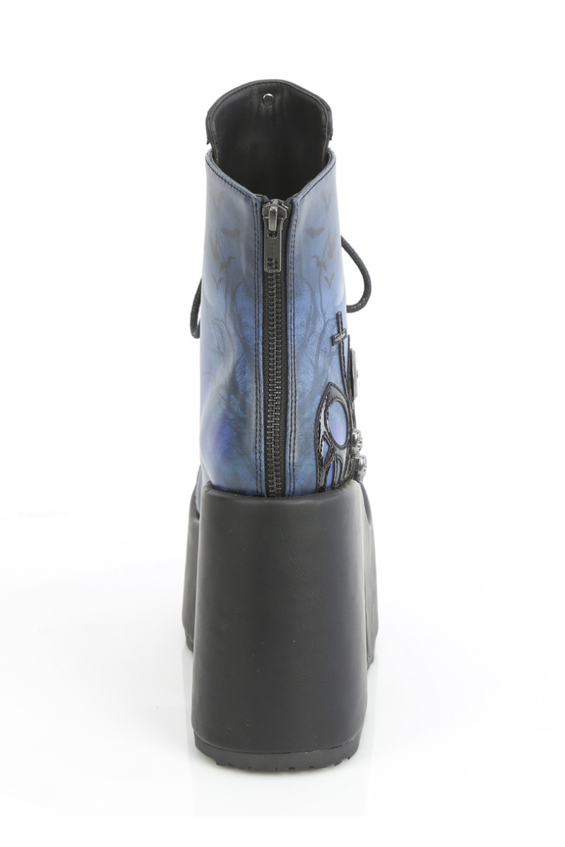 This is a platform ankle boot with a full block sole and rear zipper entry.