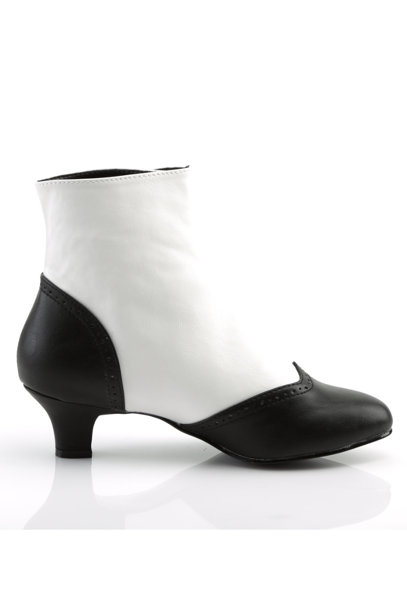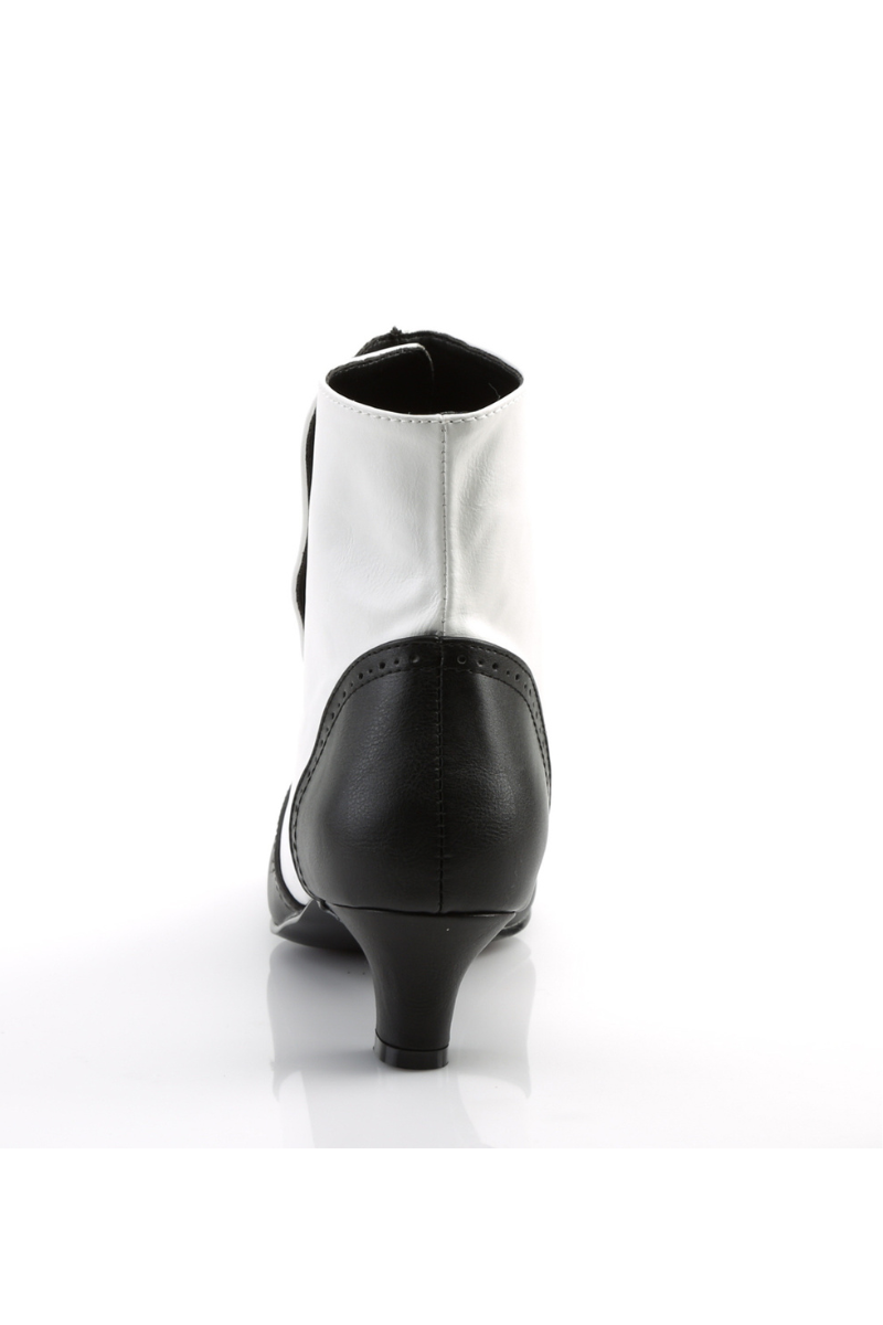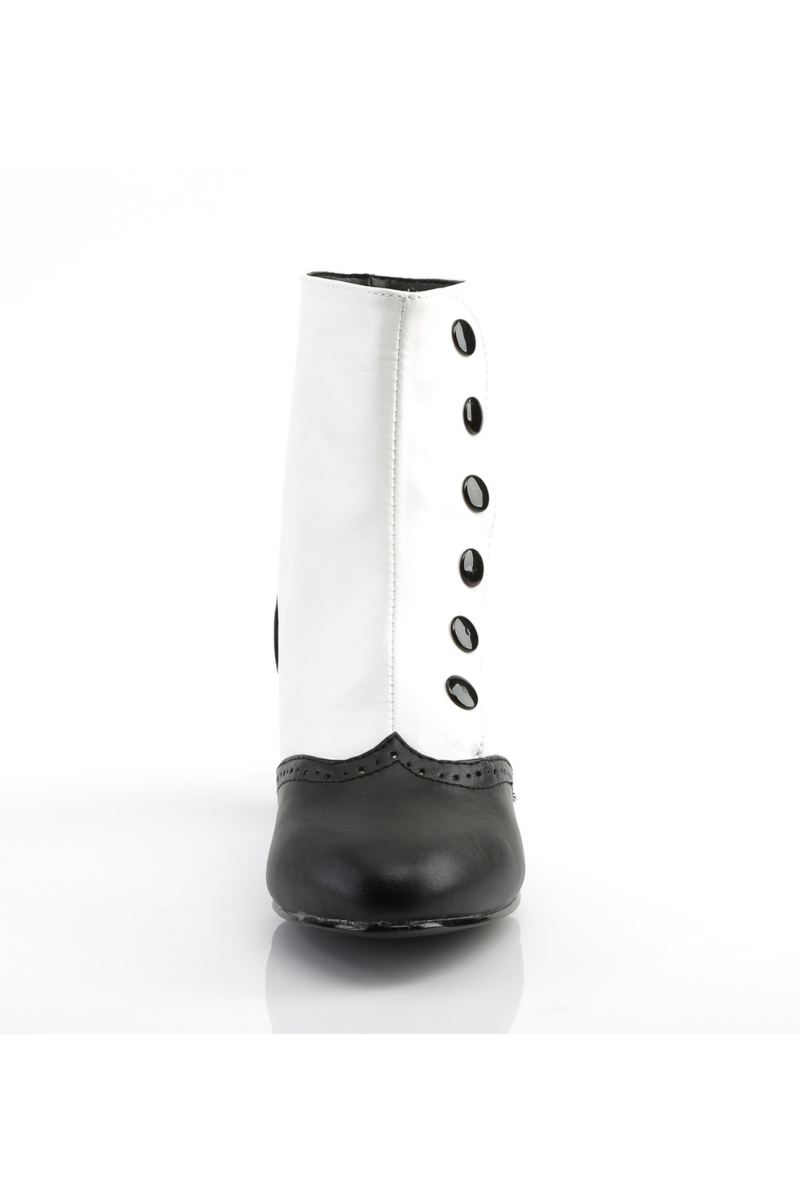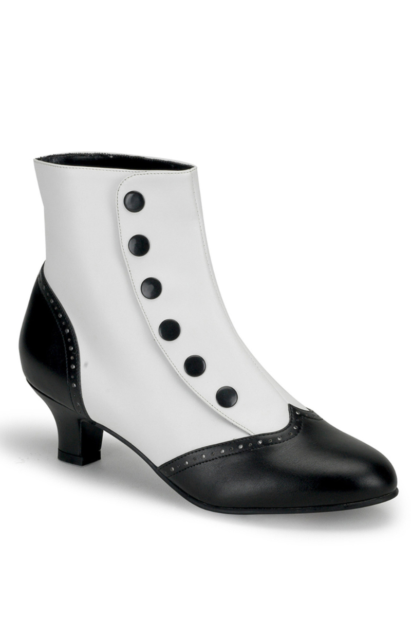 These Victorian-inspired ankle boots combine classic two-tone styling with a low 2 inch (5 cm) kitten heel for easy all-day wear. The button snap spats give them an authentic vintage look without laces or zippers, making them simple to slip on and off.
