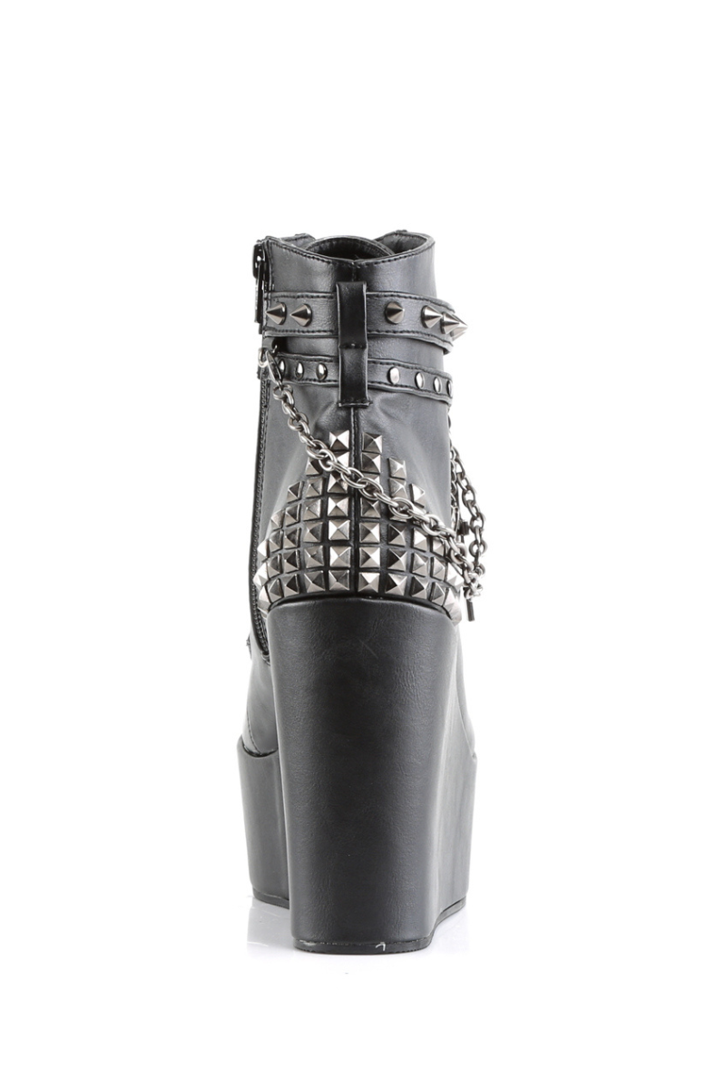 A black wedge boot with a 5-inch platform, secure lace-up front and inner side zip for easy wear. Finished with heavy chains, pyramid studs and a metal pentagram charm for added edge, it delivers strong visual impact while staying stable and wearable for long events.